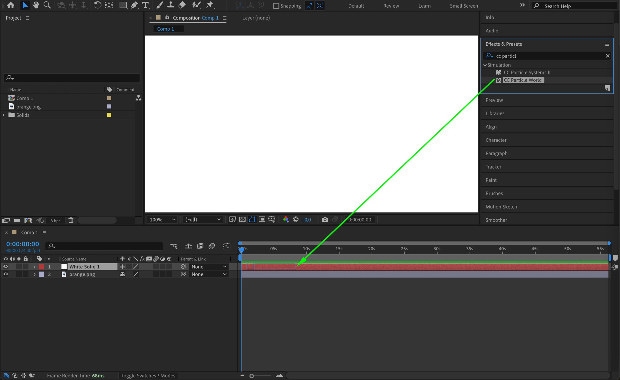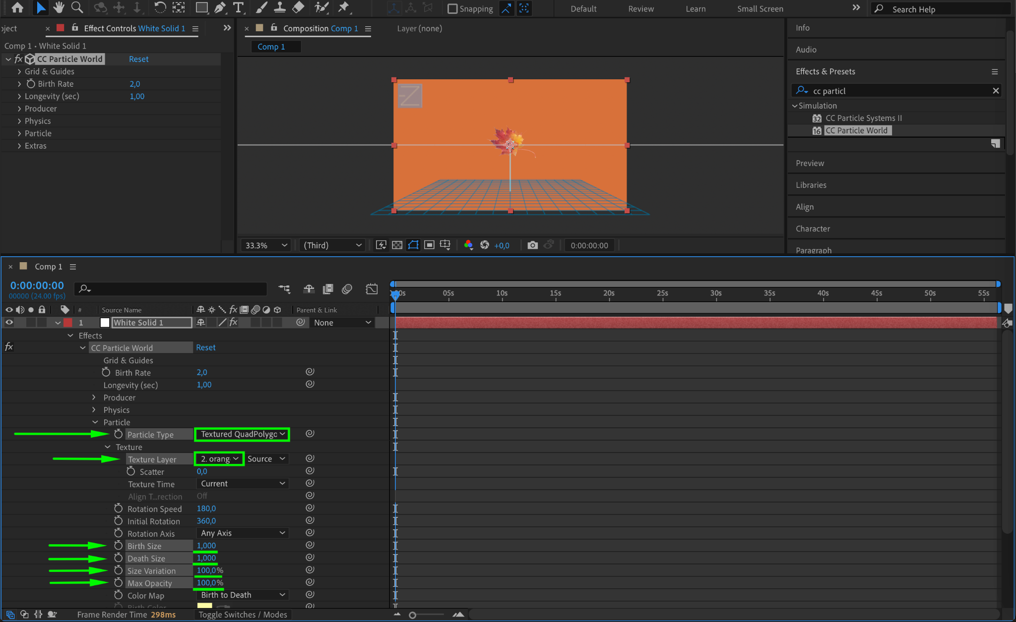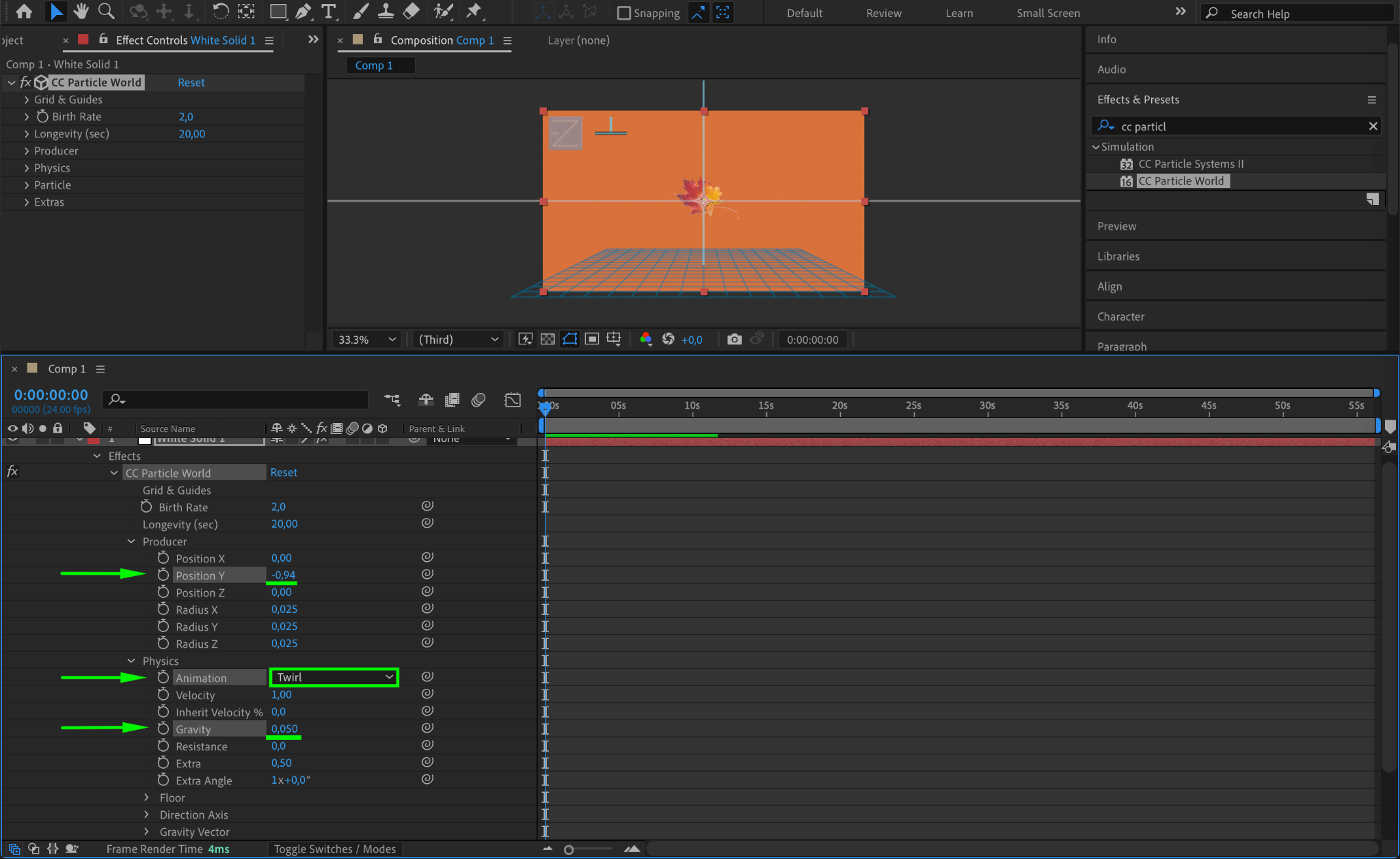 With the solid layer selected, open the Effects & Presets panel and search for CC Particle World. Drag the effect onto the solid layer. CC Particle World is a versatile tool that will simulate the motion of falling leaves.