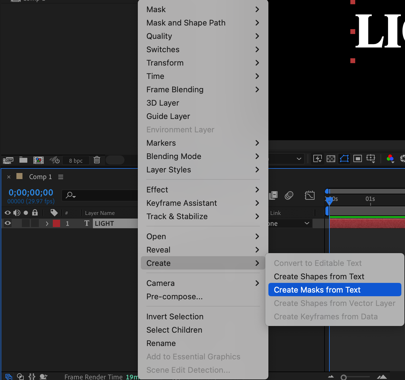 Right-click on the text layer in the timeline and select Create > Create Masks from Text. This will convert the text outlines into editable masks, preparing them for the stroke effect.