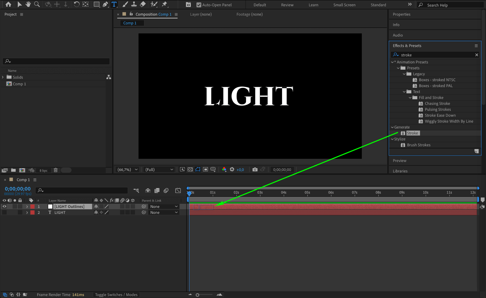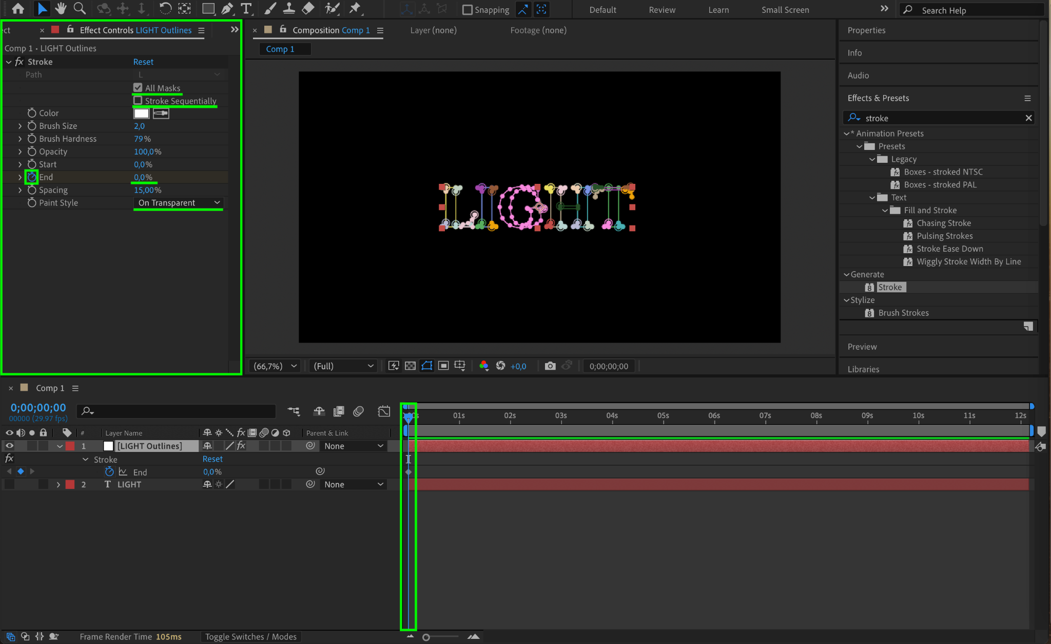 With the text outlines layer selected, go to the Effects & Presets panel and apply the Stroke effect. In the Effect Controls panel: