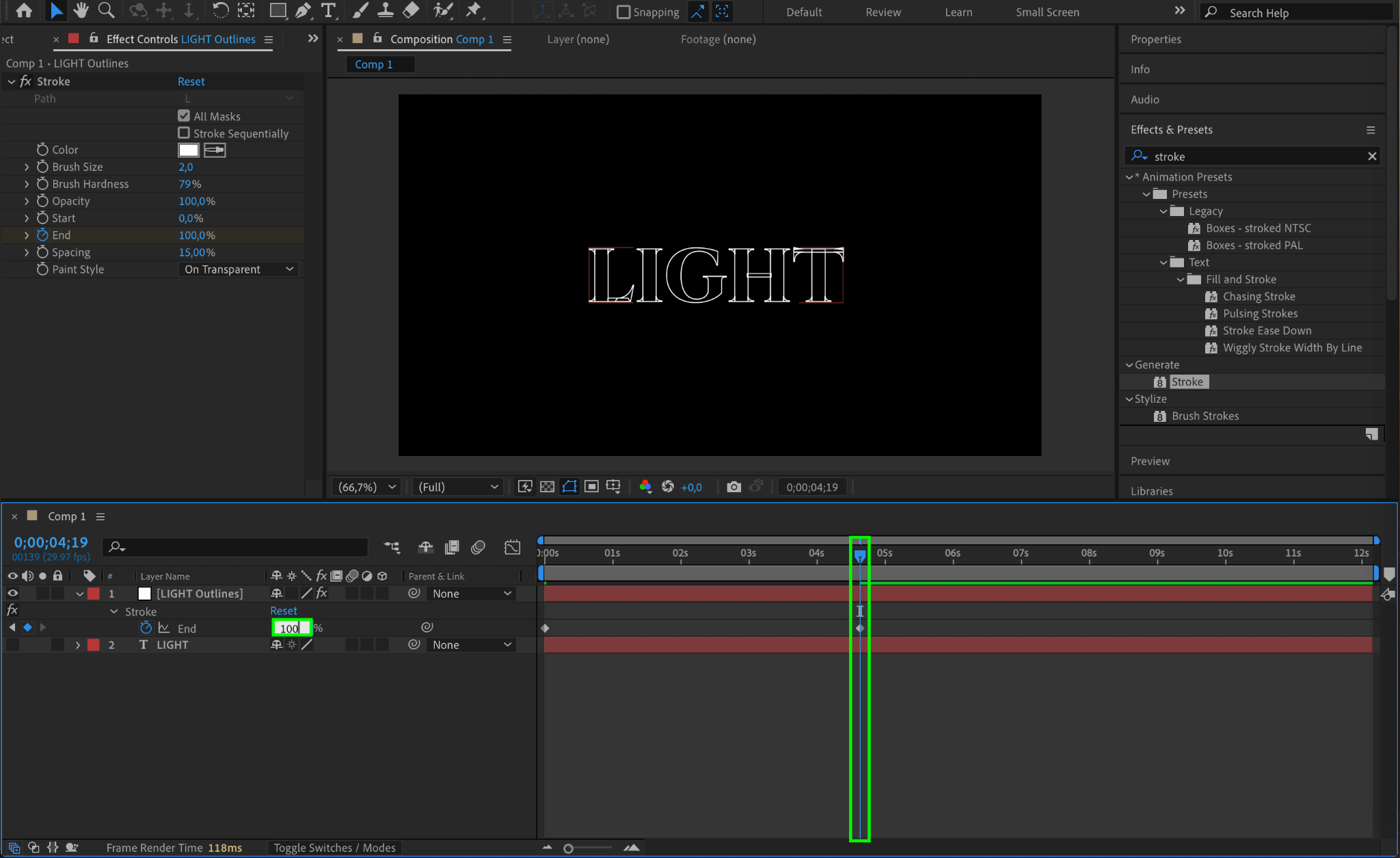 Click the stopwatch icon next to End, move the CTI (Current Time Indicator) forward, and set the value to 100 to animate the stroke.