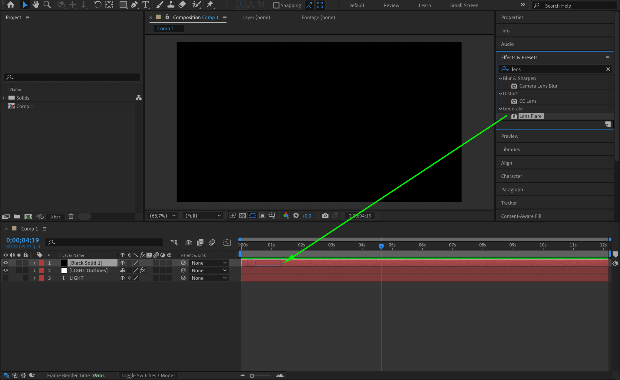 Select the black solid layer and apply the Lens Flare effect from the Effects & Presets panel. Adjust the Flare Brightness and choose a flare type that complements your text design.