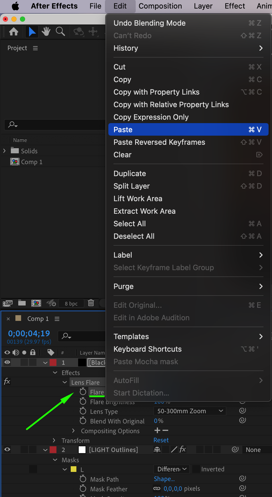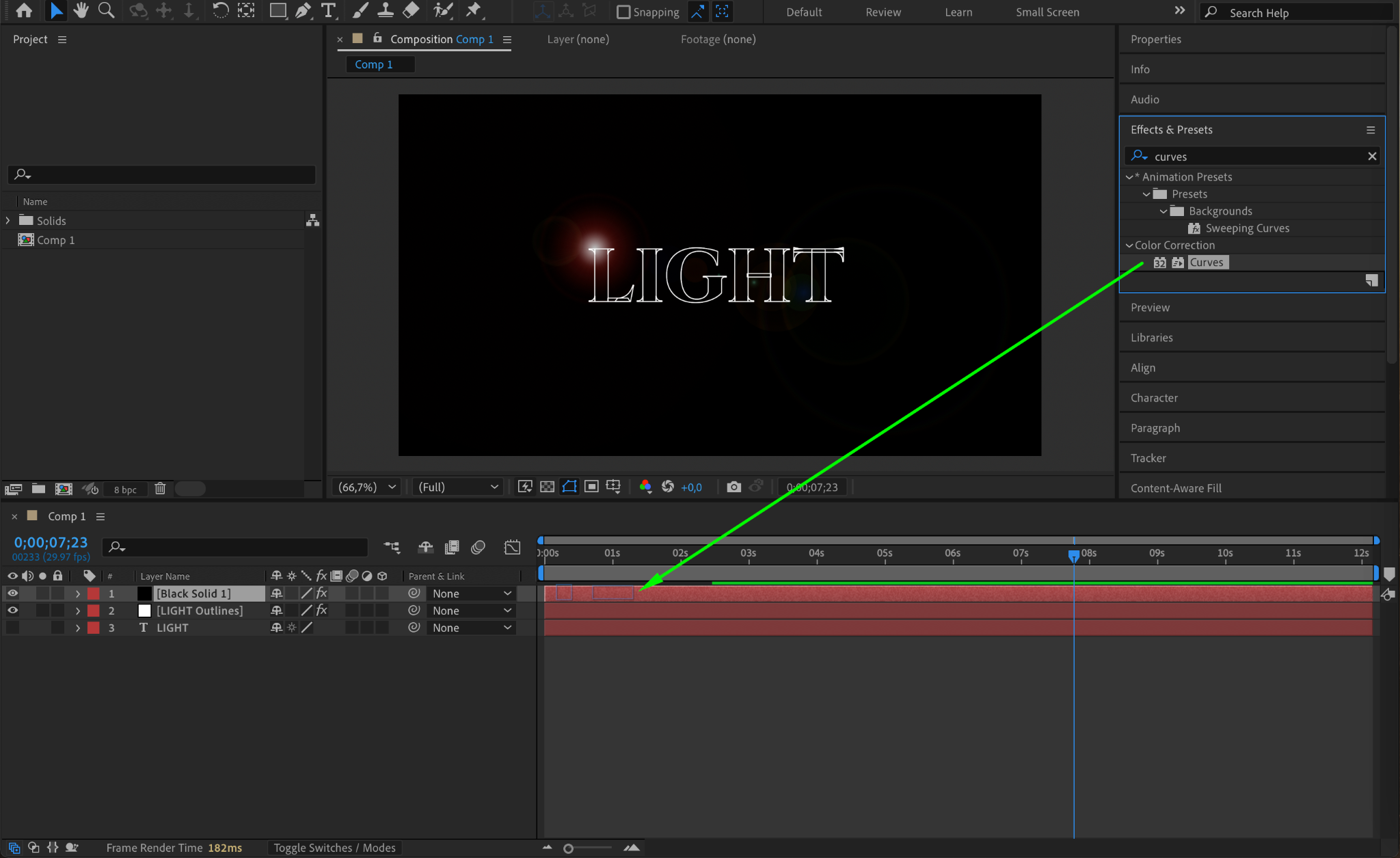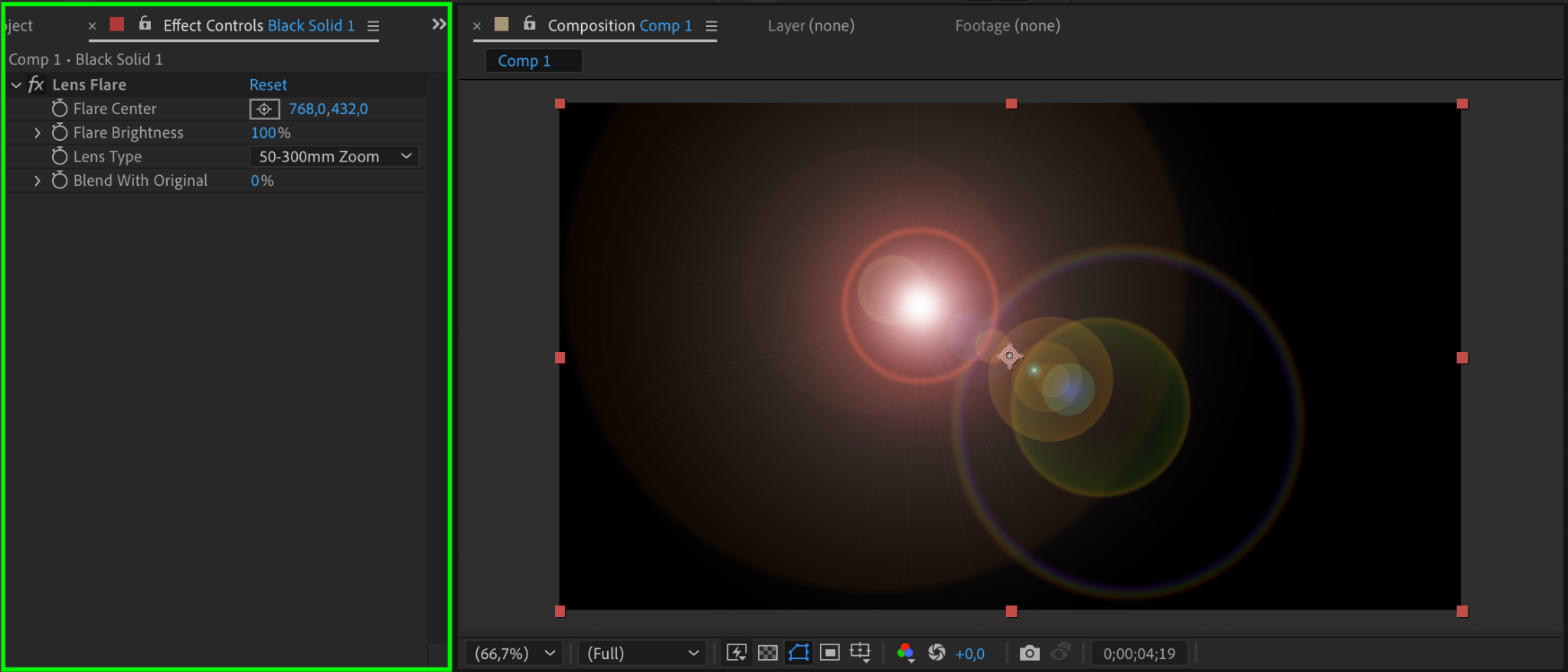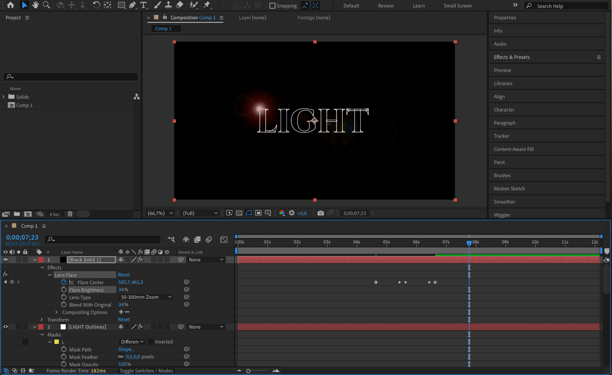 Change the black solid layer’s Blending Mode to Screen. This removes the black background while keeping the lens flare visible over the text.