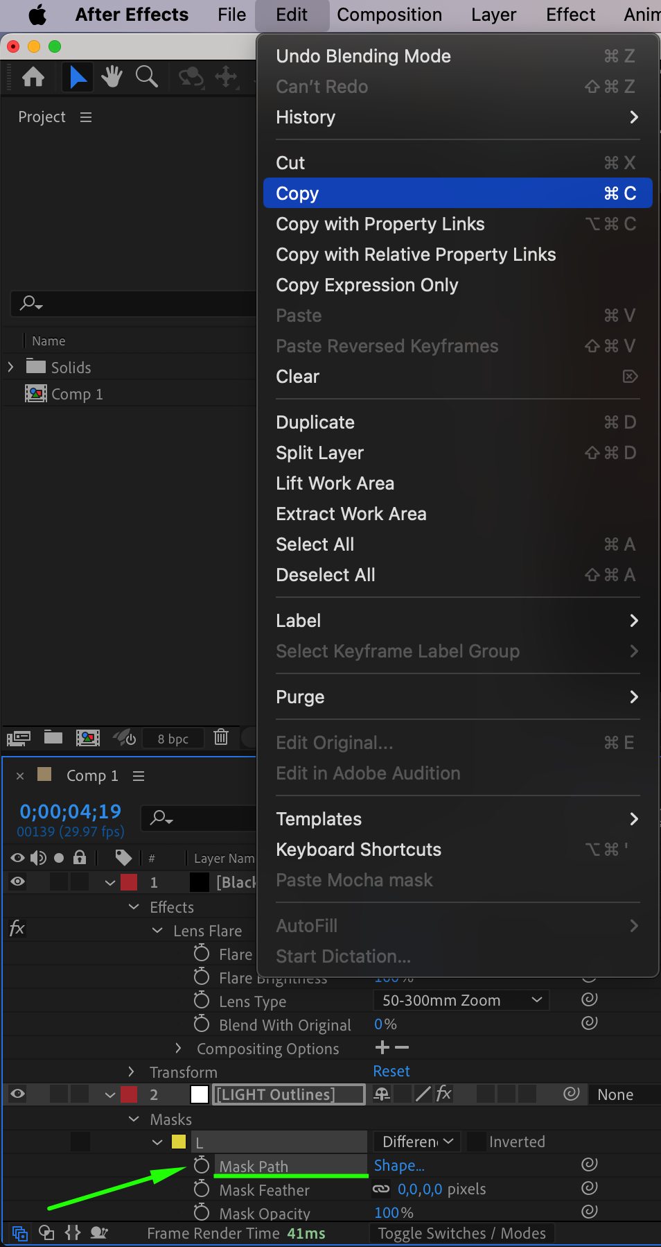 Copy the Mask Path from one of the letters in the Text Outlines layer. Paste it into the Flare Center property of the solid layer in the Effect Controls panel. This synchronizes the lens flare movement with the text stroke animation.