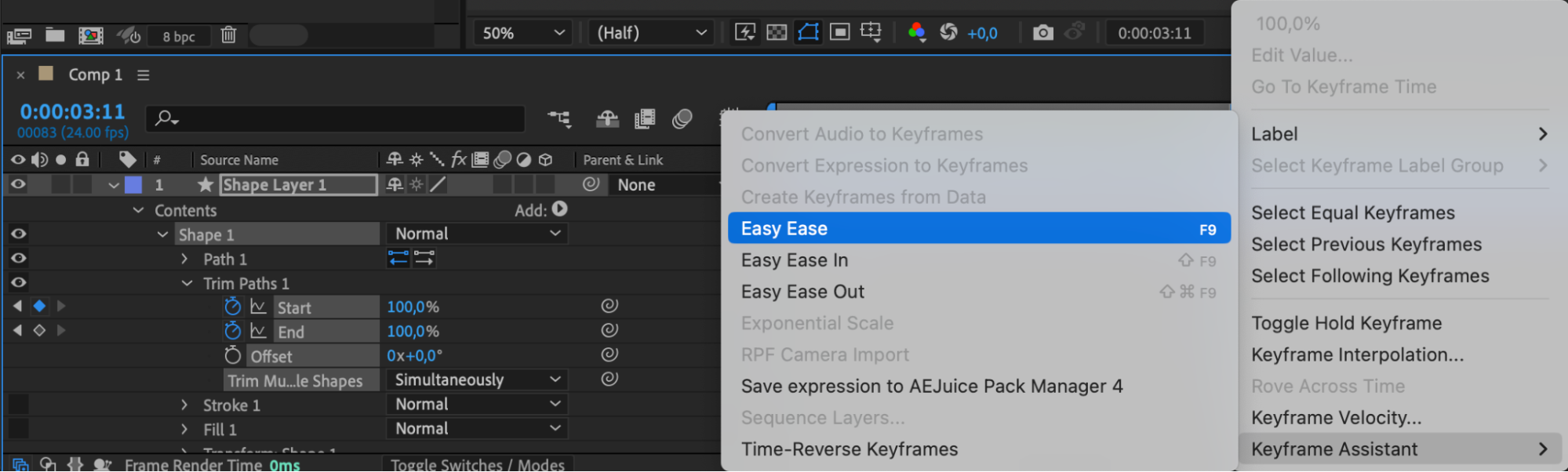 Select all keyframes, right-click, go to Keyframe Assistant > Easy Ease.