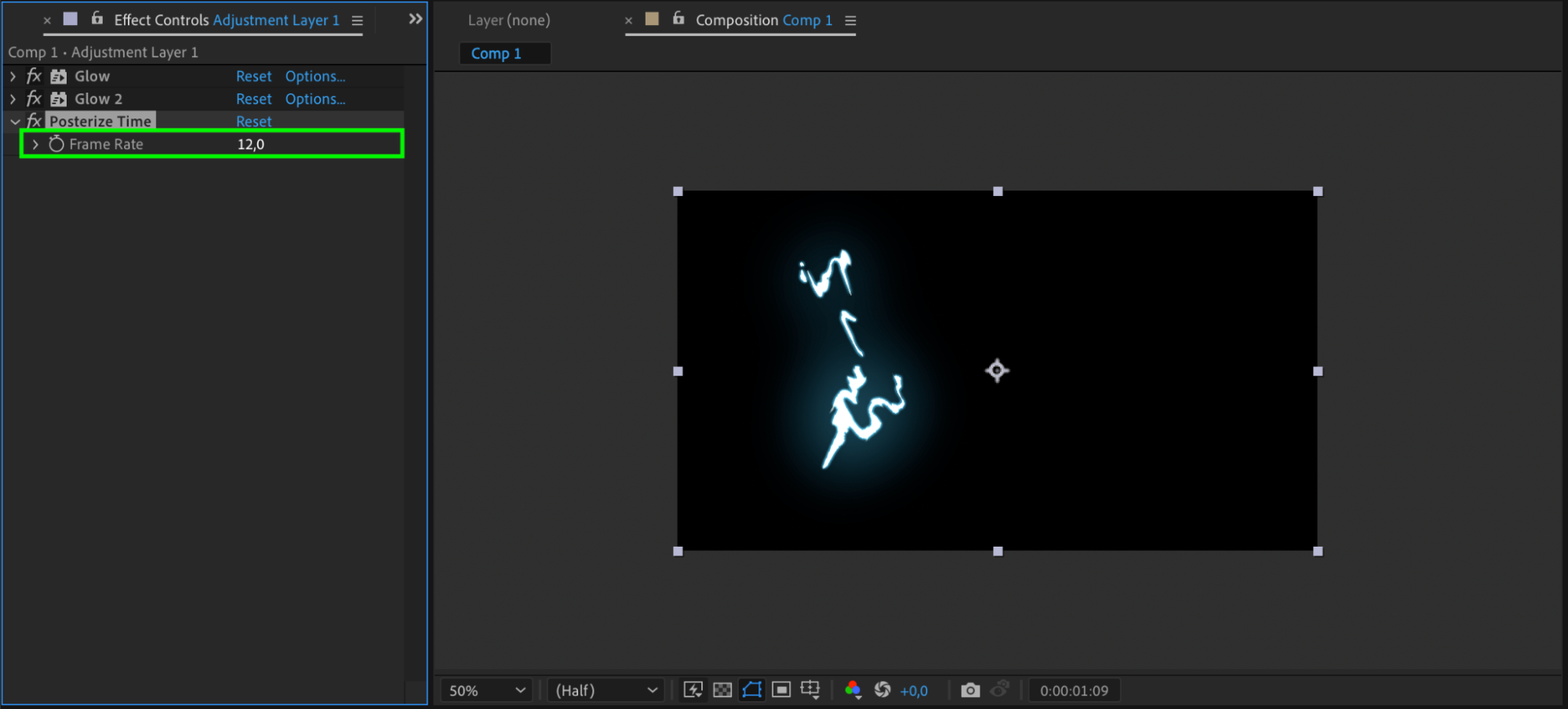Apply Posterize Time effect to the adjustment layer and set the frame rate.