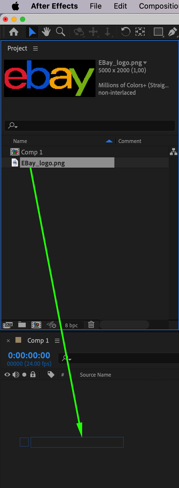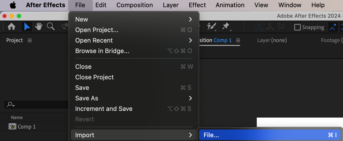 Next, import your logo file into After Effects by navigating to File > Import > File. Select the logo file. After it appears in the Project panel, drag it down to the Timeline to add it to your composition.