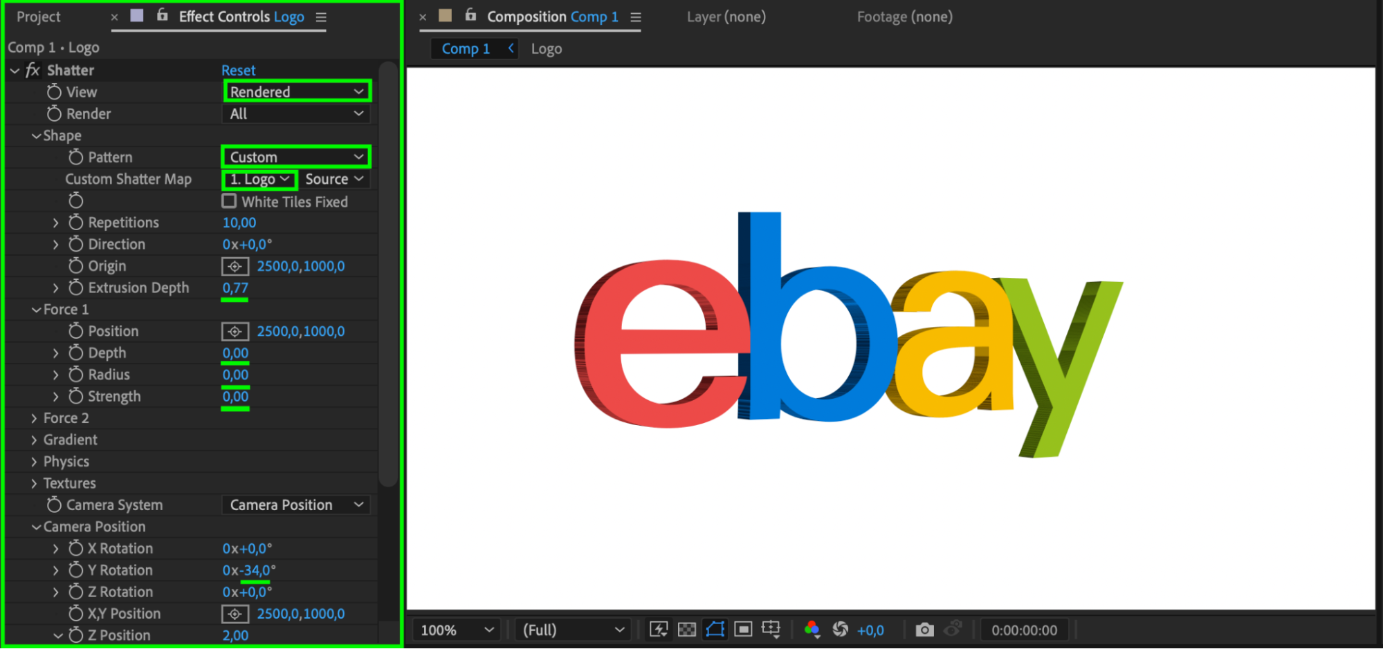 In the Effect Controls panel, customize the Shatter settings to make your logo appear 3D. Adjust the following parameters:
