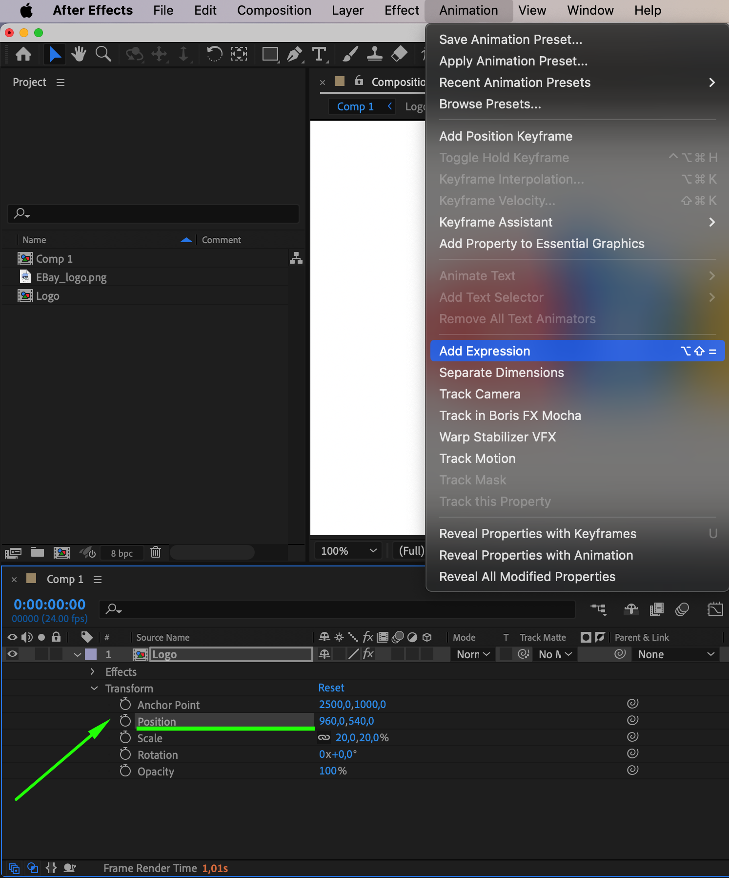 Use the Transform properties to position your logo. Select the logo layer in the timeline and press “P” to bring up the Position settings. Adjust the values as needed to place your logo centrally within the frame. You can also press “S” to scale the logo to your preferred size, ensuring it fits well in the composition.