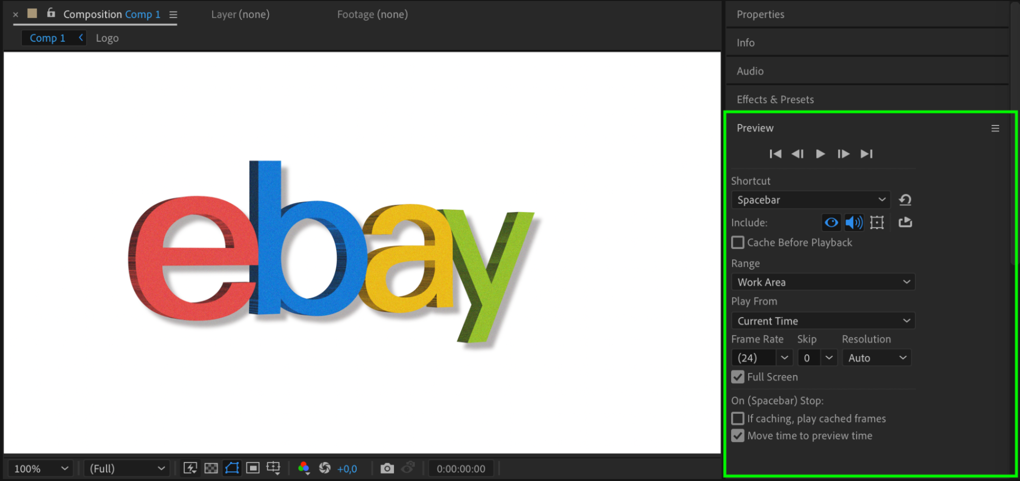 Once you’ve set the keyframes and added effects, preview your work by pressing the Spacebar. Ensure the animation runs smoothly and tweak any parameters if needed. This step allows you to check how your 3D logo looks in motion before rendering.