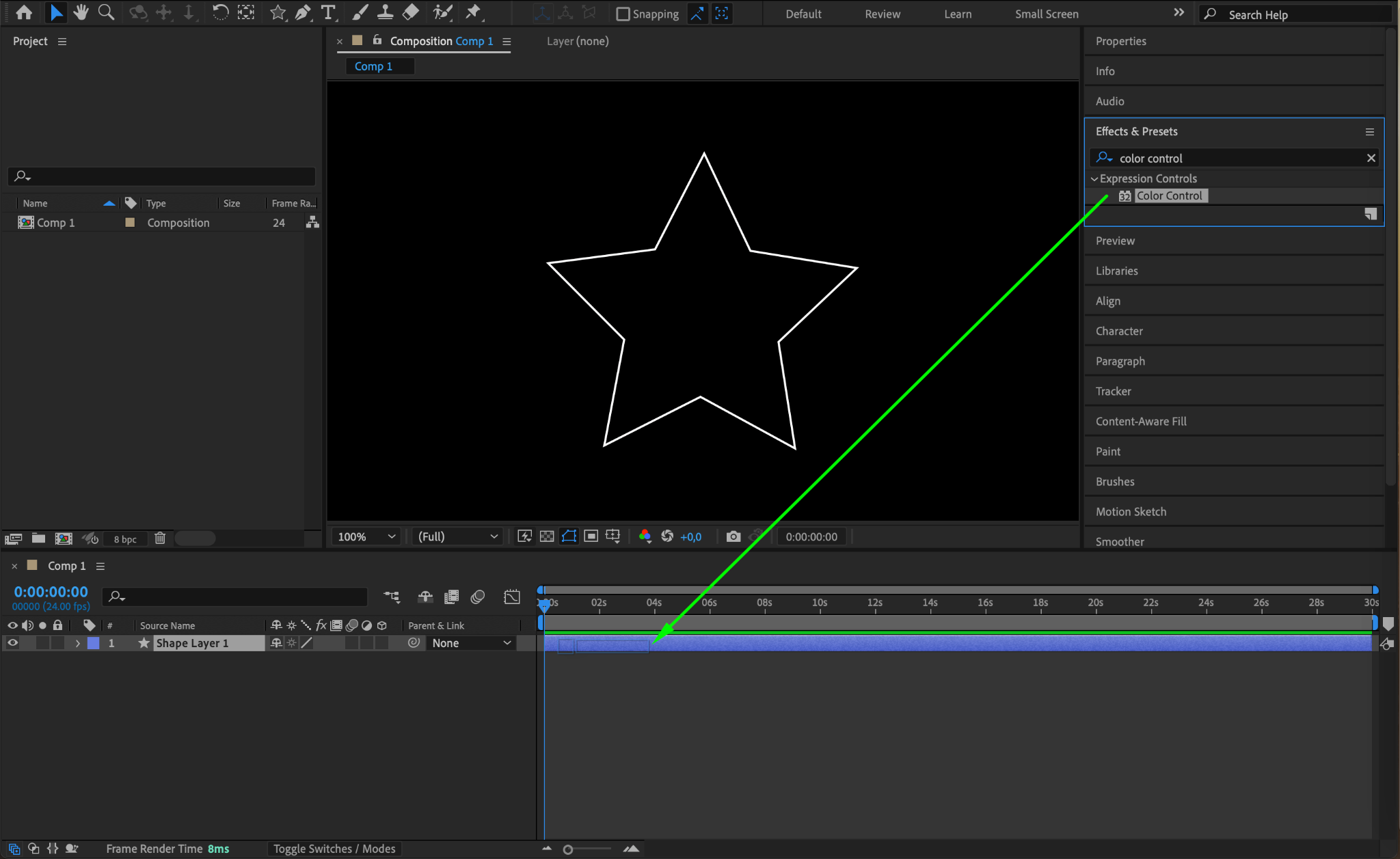 With your shape or text layer selected, go to the Effects & Presets panel and search for the “Color Control” effect. Drag this effect onto your layer. This will allow you to easily change the color of your neon effect later on. By controlling the color centrally, you ensure that all elements of your neon design stay consistent in hue.