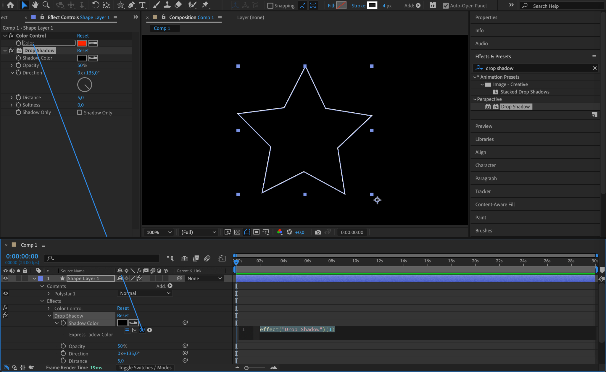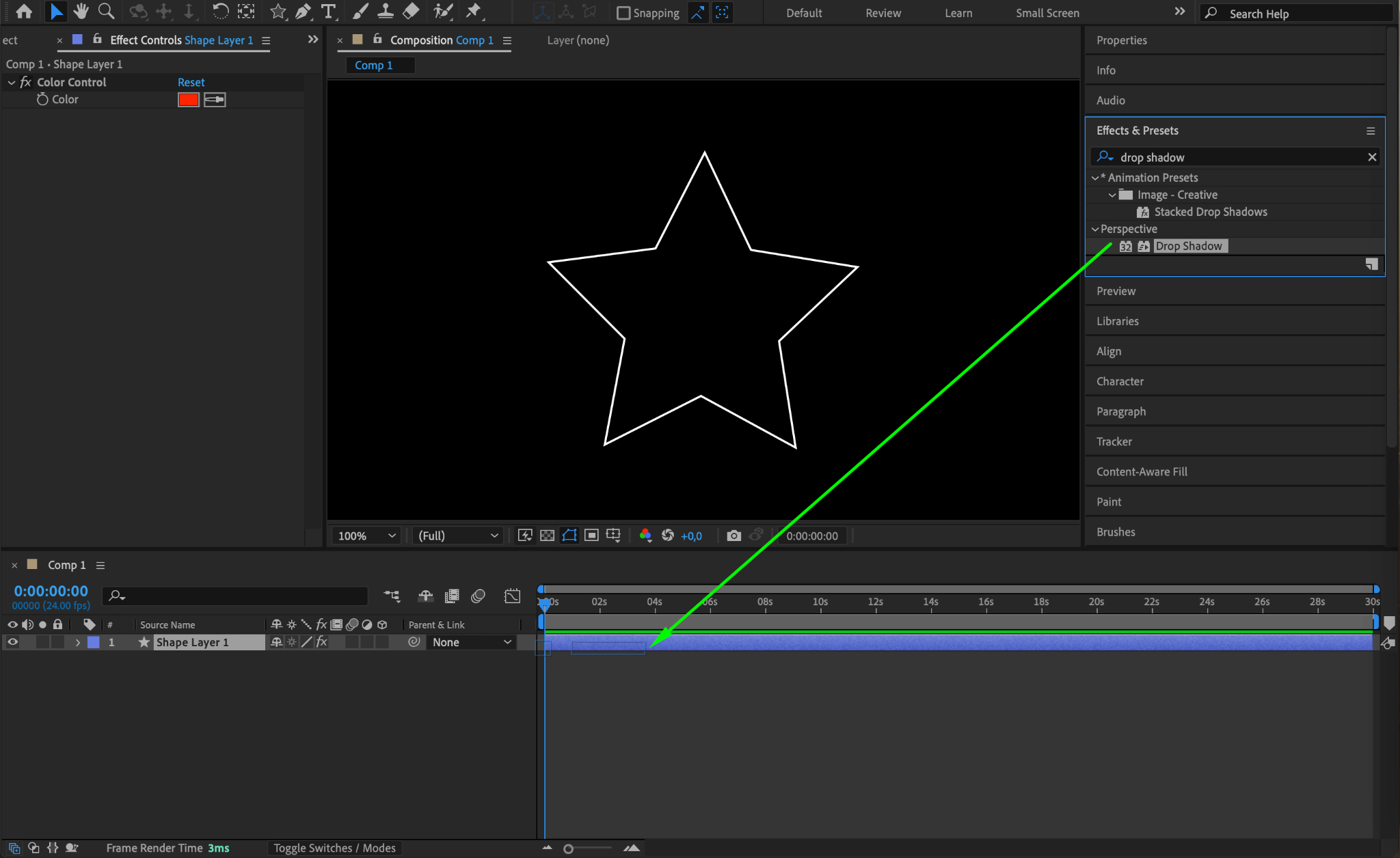 In the Effects & Presets panel, search for the “Drop Shadow” effect and drag it onto your layer. This effect will create the first layer of glow around your shape or text, simulating the light spread from a neon tube. The initial settings might not show much, but we’ll build on this in the next steps.