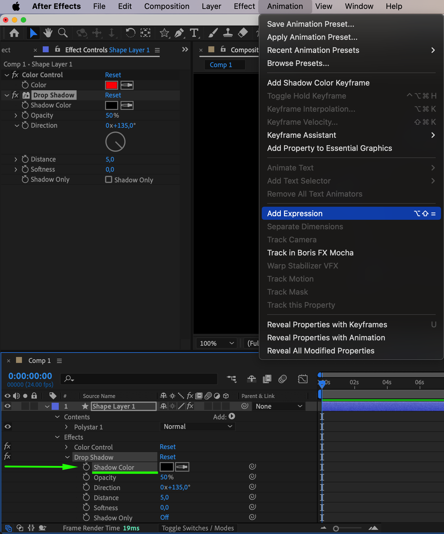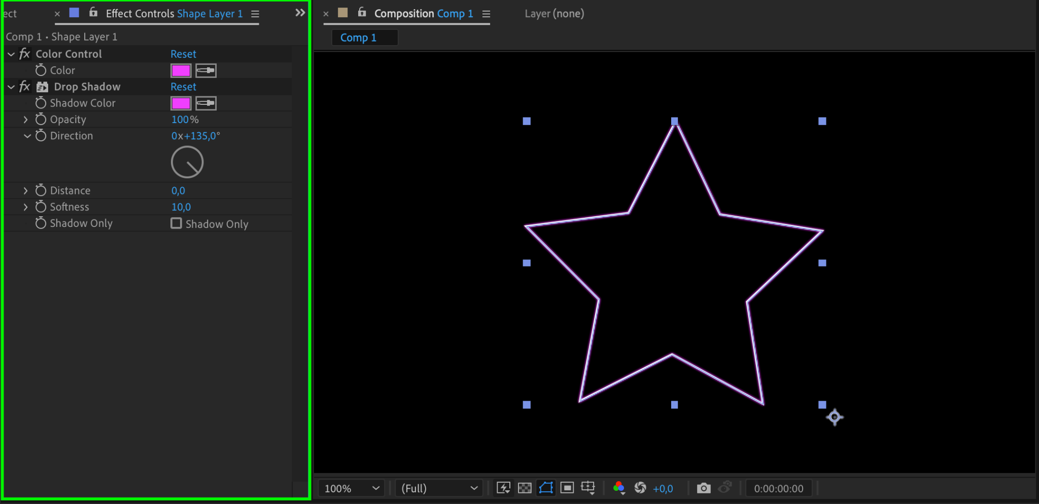 Expand your layer’s properties by clicking on the arrow next to the layer name. Go to Effects > Drop Shadow, and find the Shadow Color parameter. Click on the pick whip icon (a spiral-looking icon) next to Shadow Color, and drag it to the Color parameter of the Color Control effect. This will link the two, so any changes to the Color Control will automatically update the shadow color, keeping your neon effect cohesive.