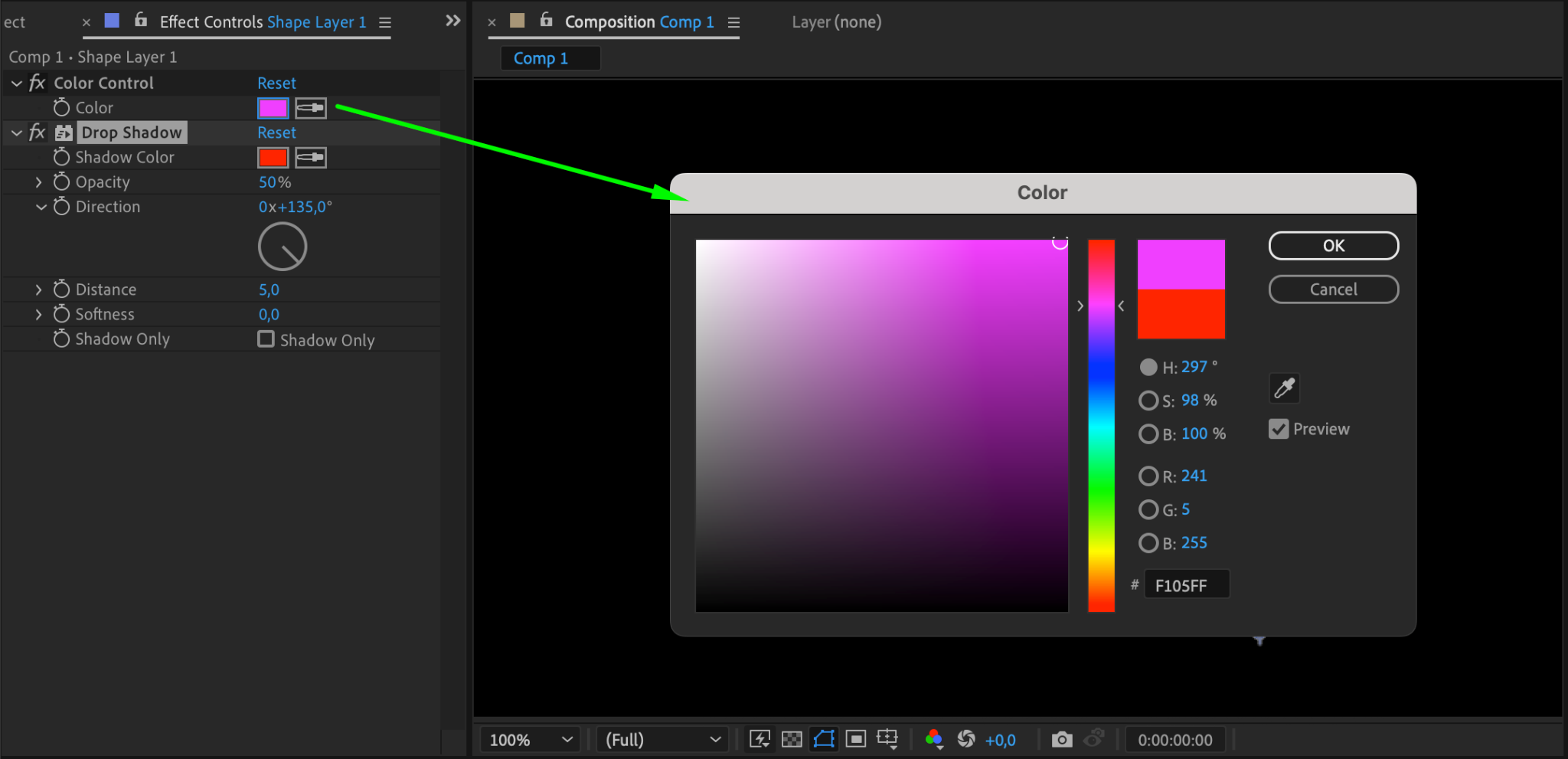 In the Effect Controls panel, click on the color swatch next to the Color parameter in the Color Control effect. A color picker window will open, allowing you to choose the neon color you desire. After selecting your color, click OK. Your shape or text will now display the chosen neon color, but with a subtle glow. The next steps will enhance this glow.