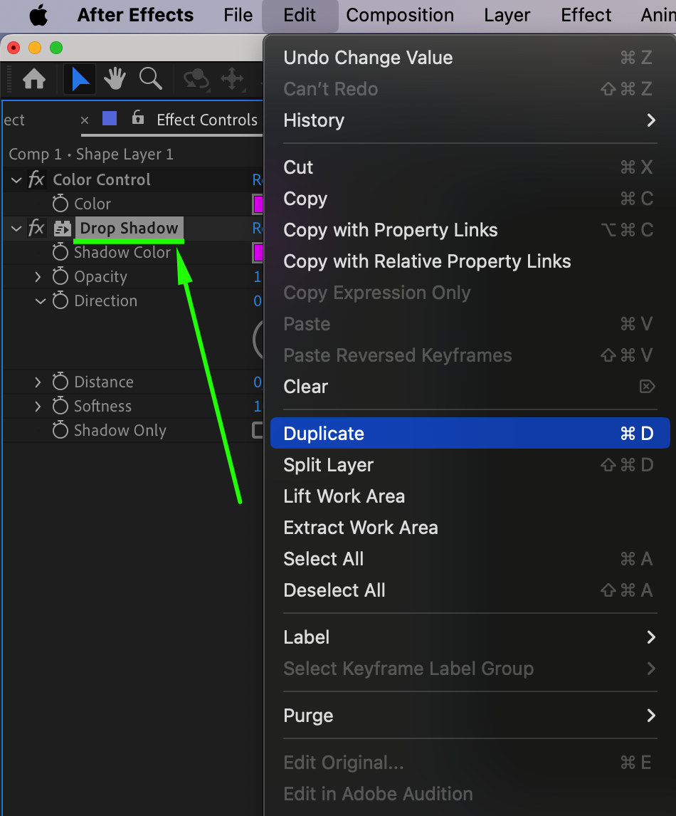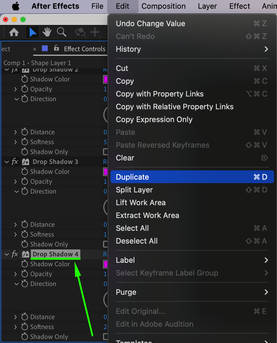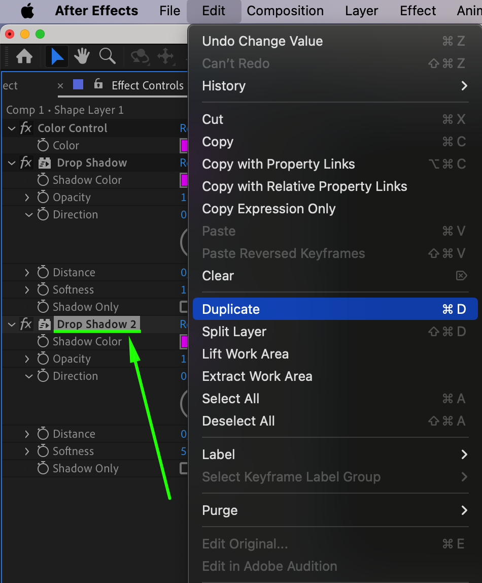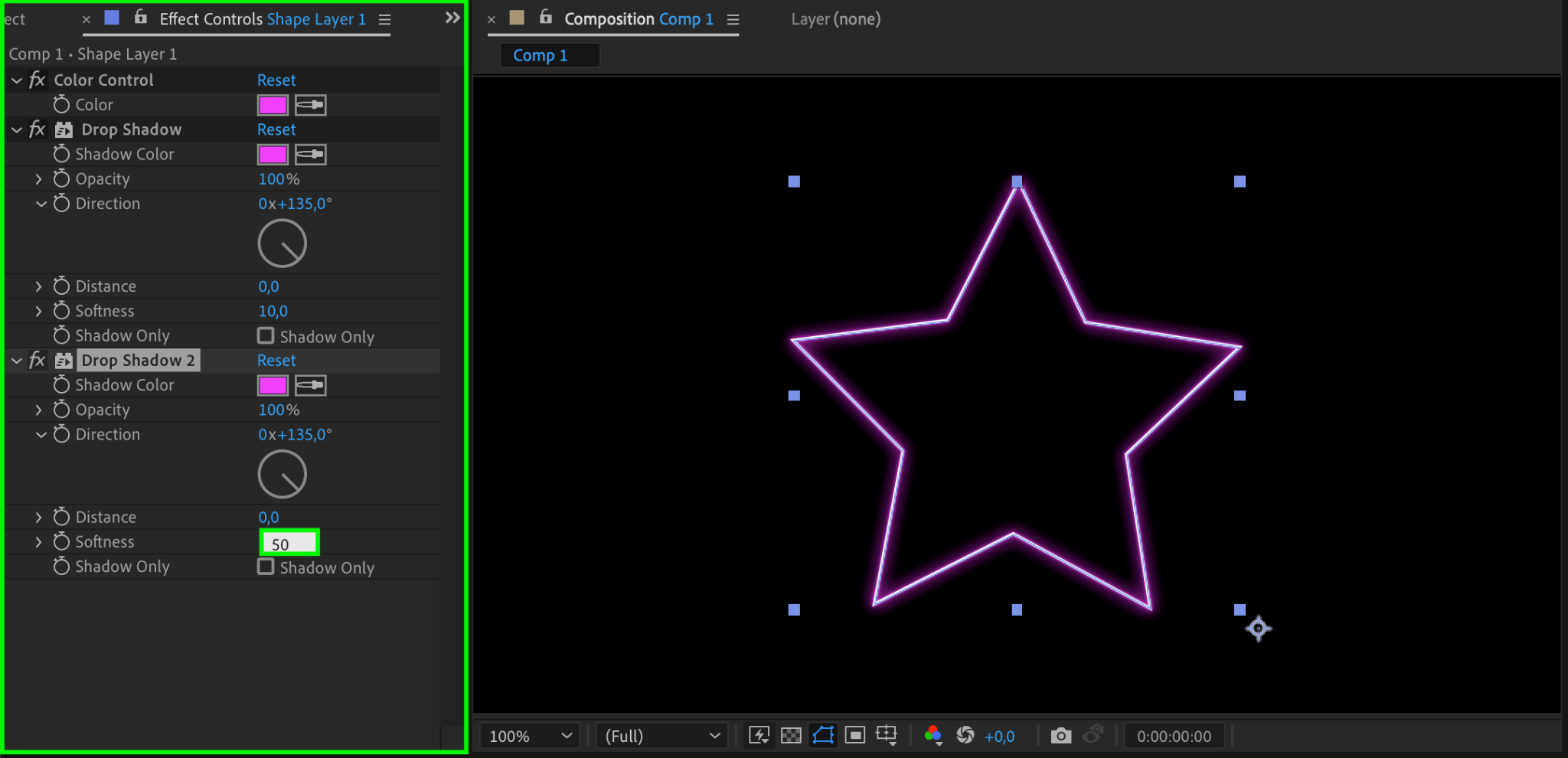 To intensify the neon glow, duplicate the Drop Shadow effect. With the Drop Shadow effect selected in the Effect Controls panel, go to Edit > Duplicate or use the shortcut “Ctrl/Cmd + D”. In the duplicated Drop Shadow effect (now named Drop Shadow 2), increase the Softness value to around 50. This will create a softer, more diffused glow around your shape or text.