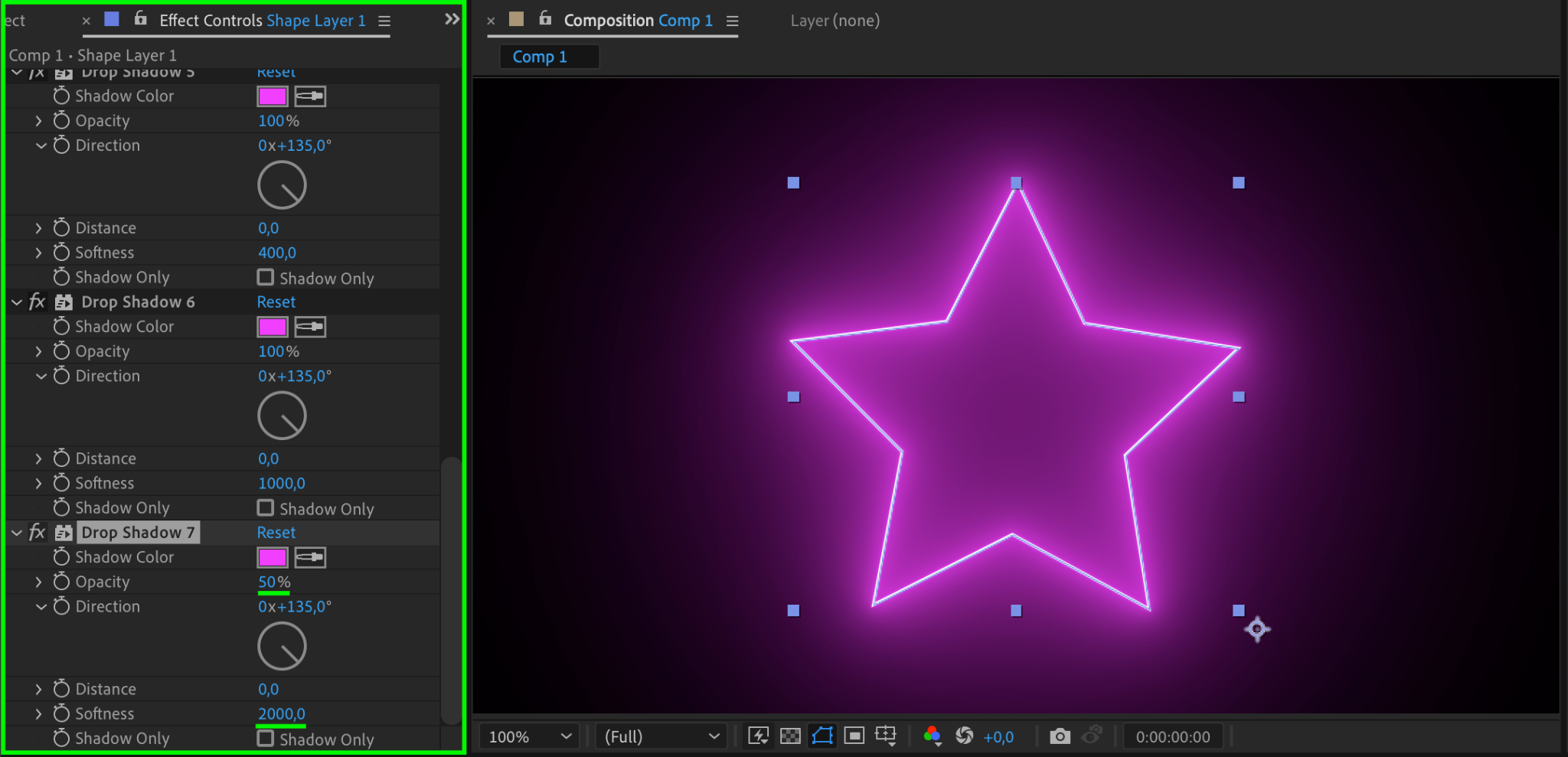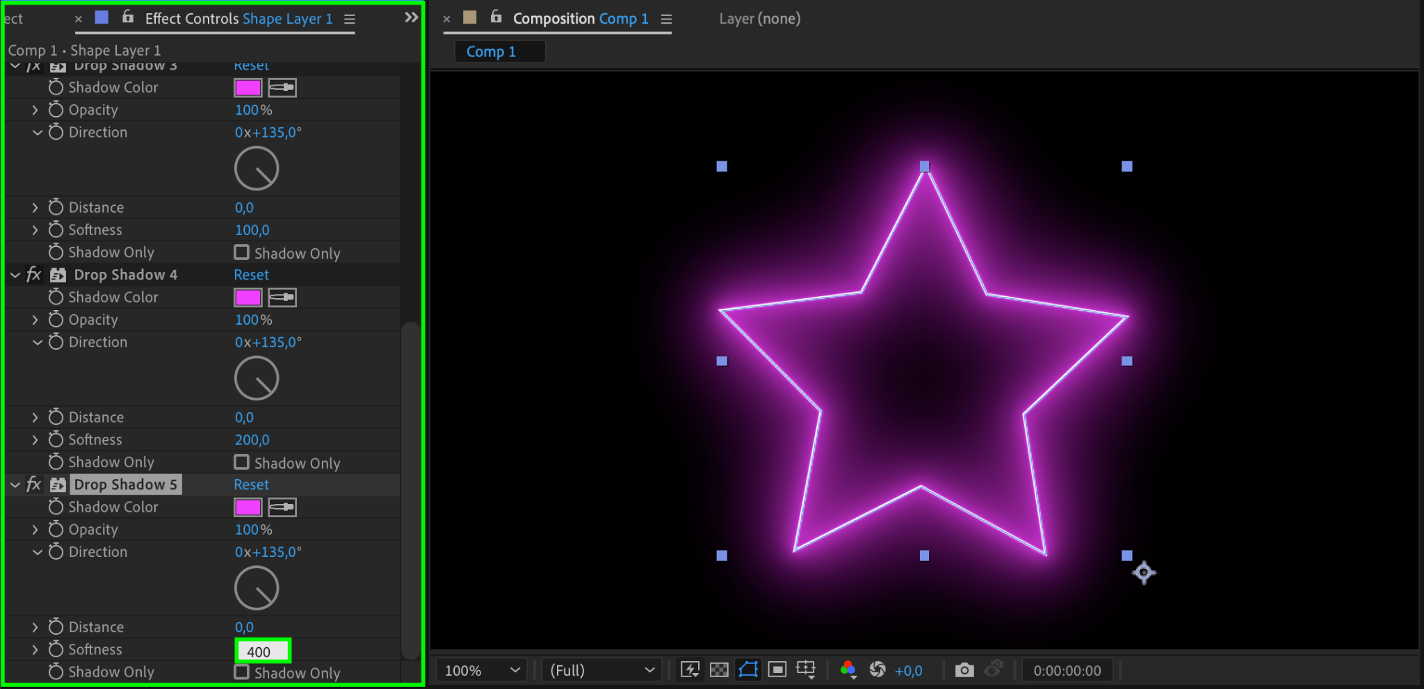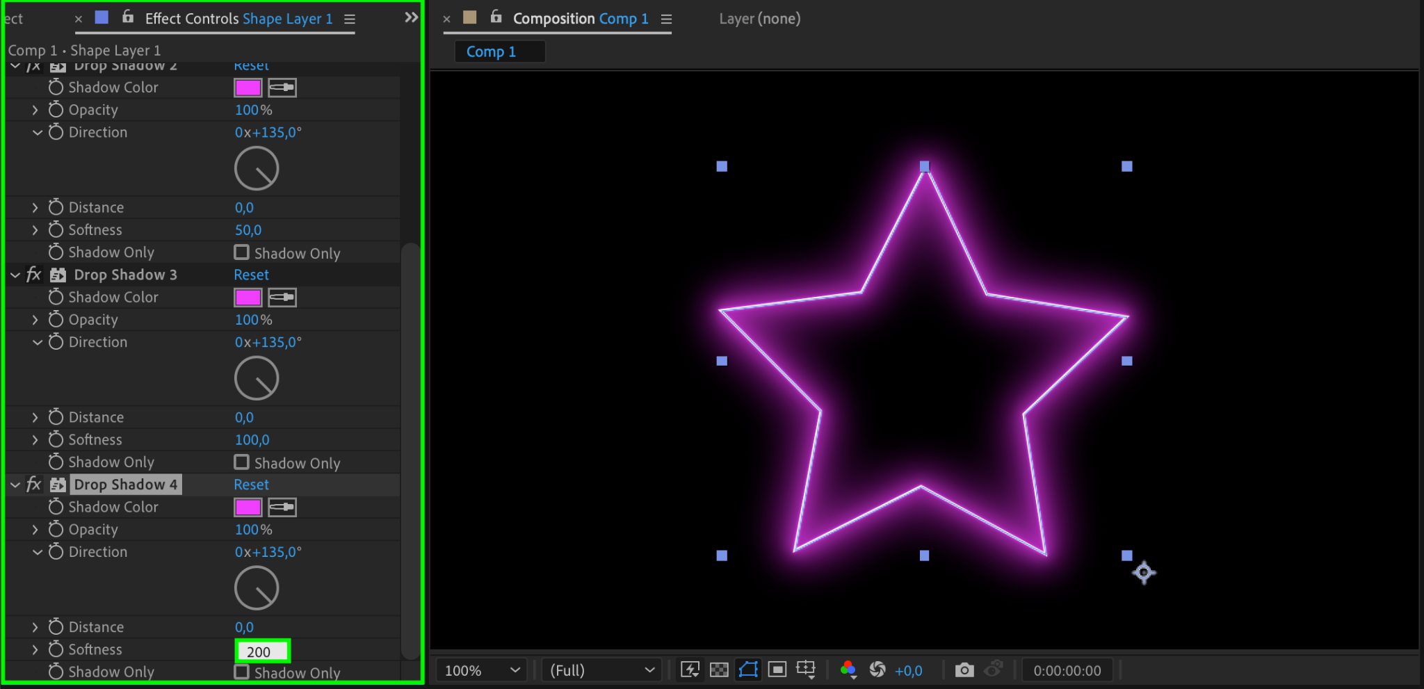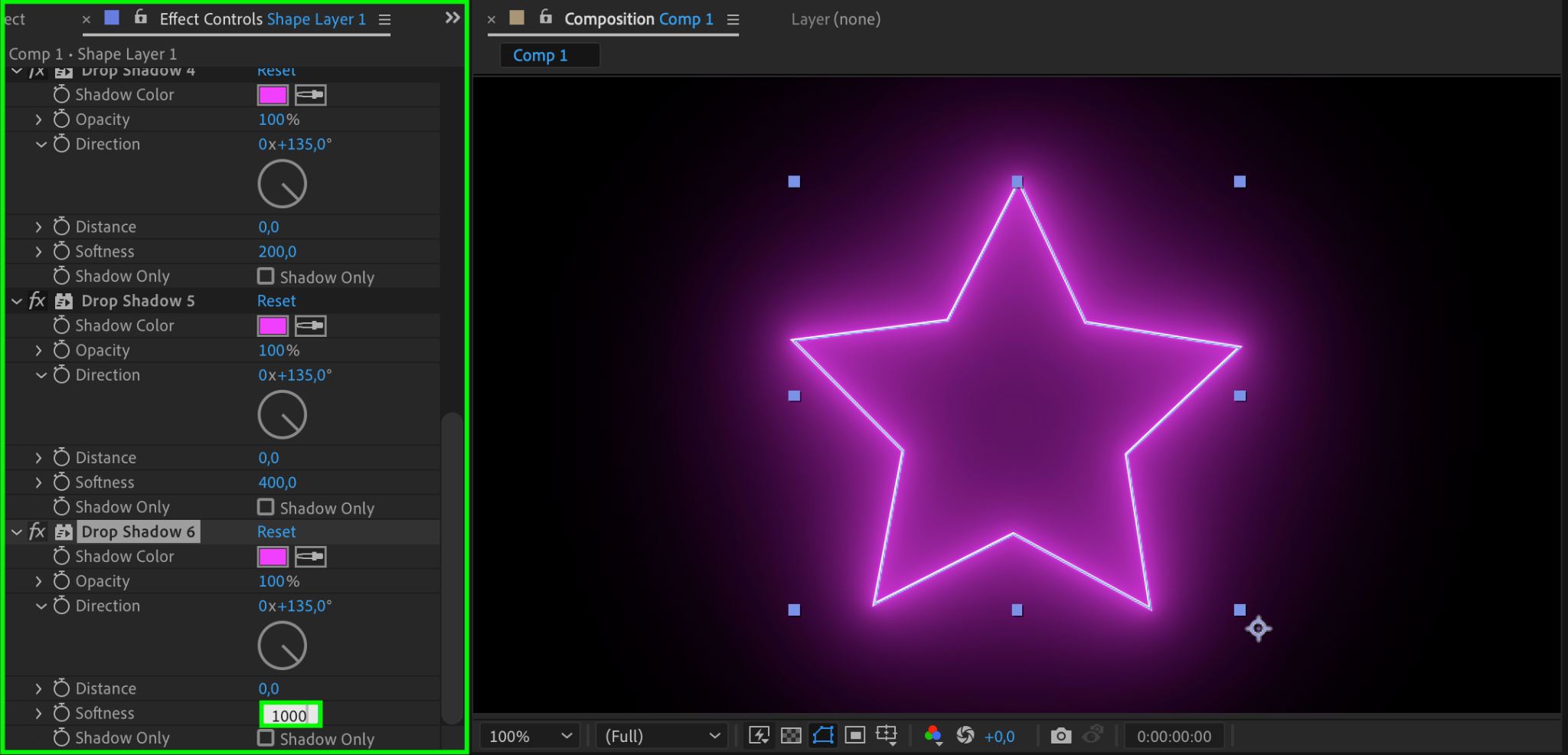 Repeat the duplication process to build up the glow. Select Drop Shadow 2 and duplicate it again to create Drop Shadow 3. This time, set the Softness to 100. Continue this process, creating Drop Shadow 4, Drop Shadow 5, Drop Shadow 6, and Drop Shadow 7, each time doubling the Softness (200, 400, 1000, 2000). This gradual increase in softness will give your neon effect a rich, layered glow.