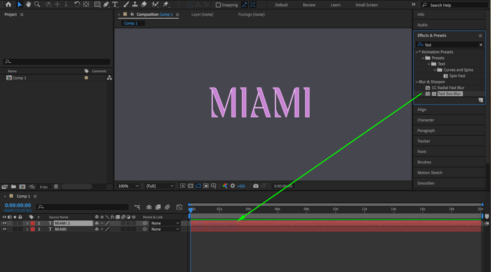 To make the text truly shine, duplicate the text layer. Apply the Fast Box Blur effect to the duplicated layer, adjusting the settings to create a soft glow around the text.