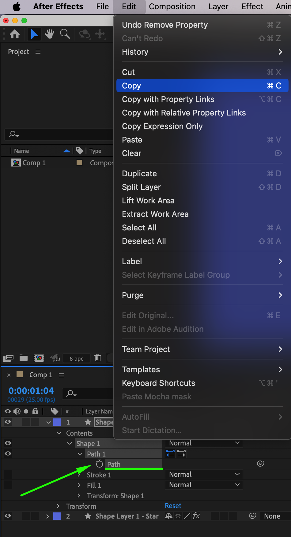 Expand the properties of the shape layer containing your path. Navigate to “Shape 1” > “Path 1” > “Path”, then click on the Path to highlight it and press “Ctrl/Cmd + C” to copy it.