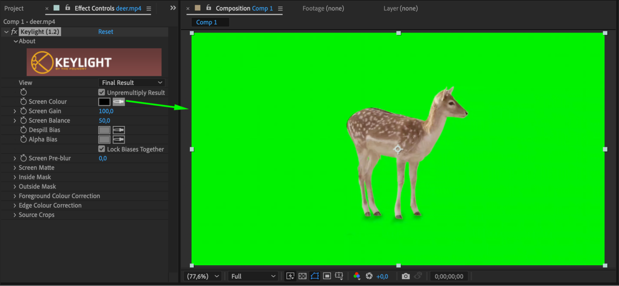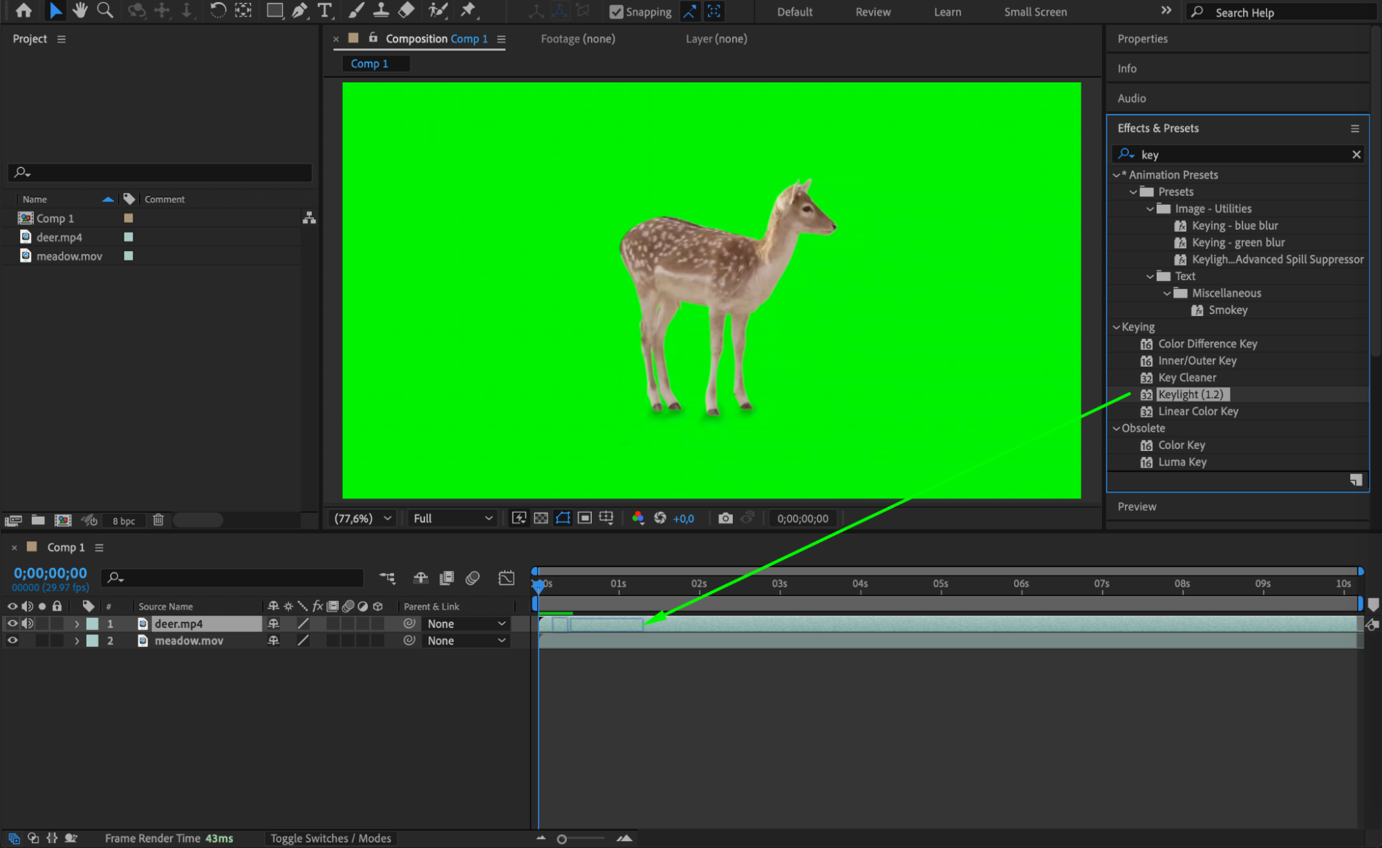 Select the object layer and apply the Keylight (1.2) effect from the Effects & Presets panel. In the Effect Controls panel, use the eyedropper tool to select the green background. This will key out the green, making the object appear over your background.