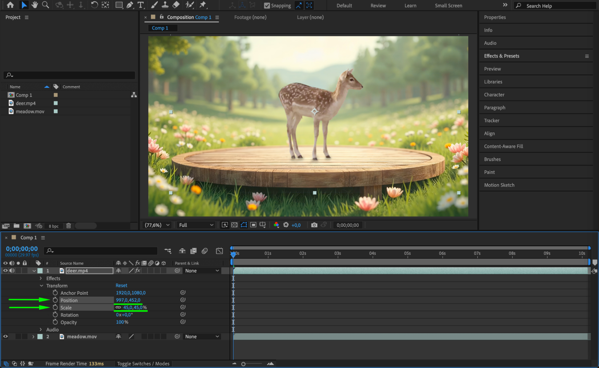 Expand the object layer’s transform properties by clicking the arrow next to it. Use Position and Scale to place and size the object properly within the scene. Animate these values if the background or object needs to move in sync.