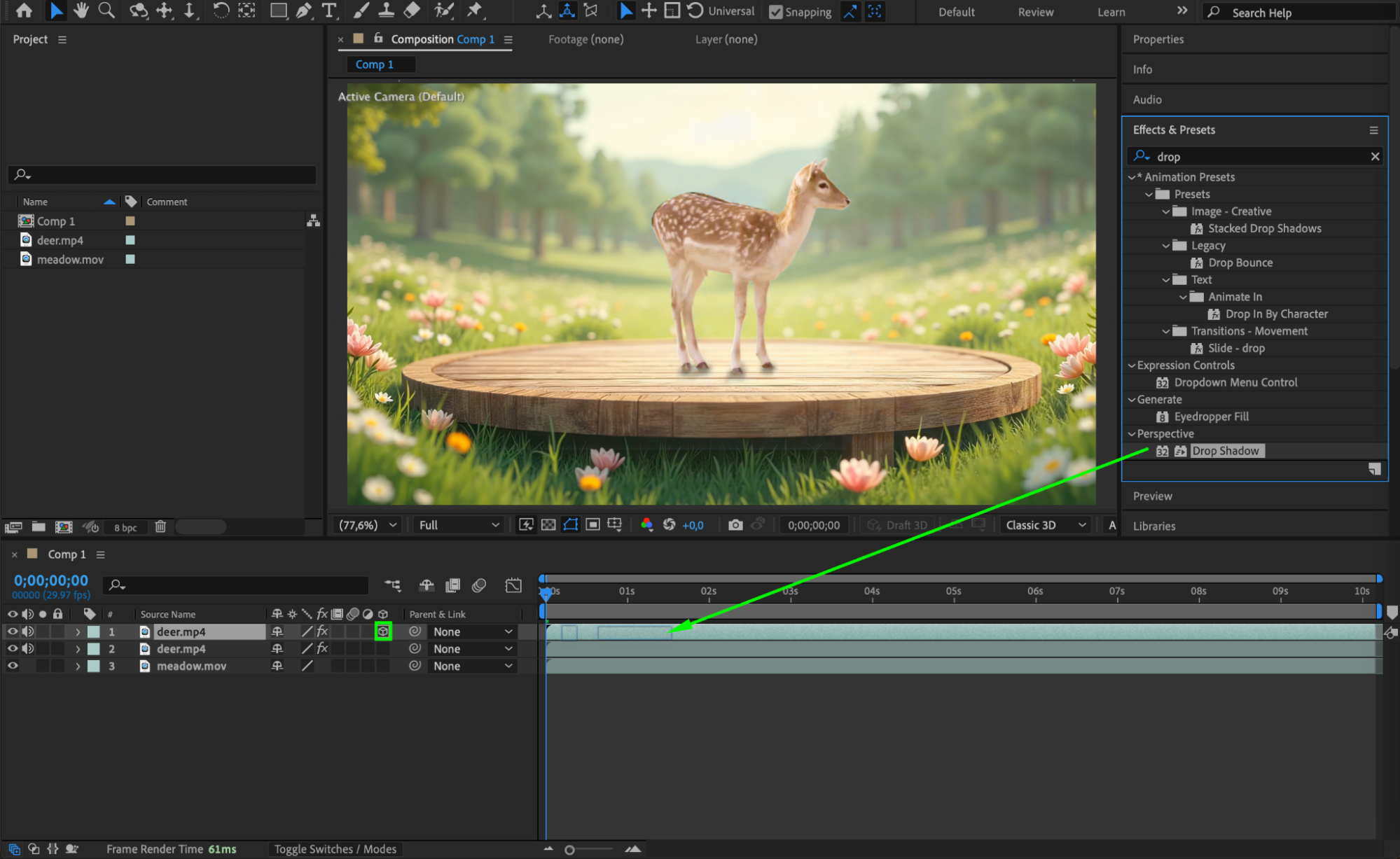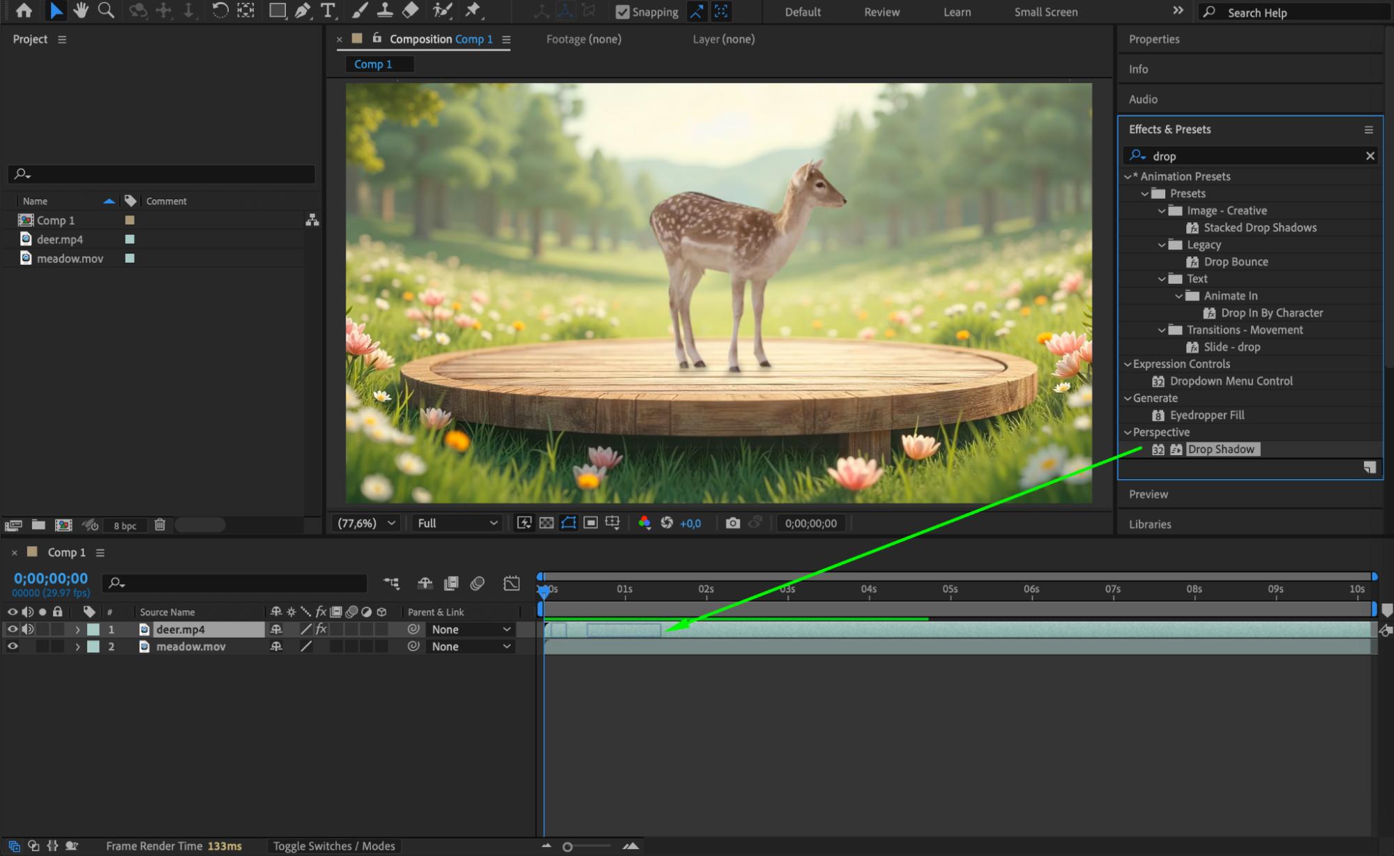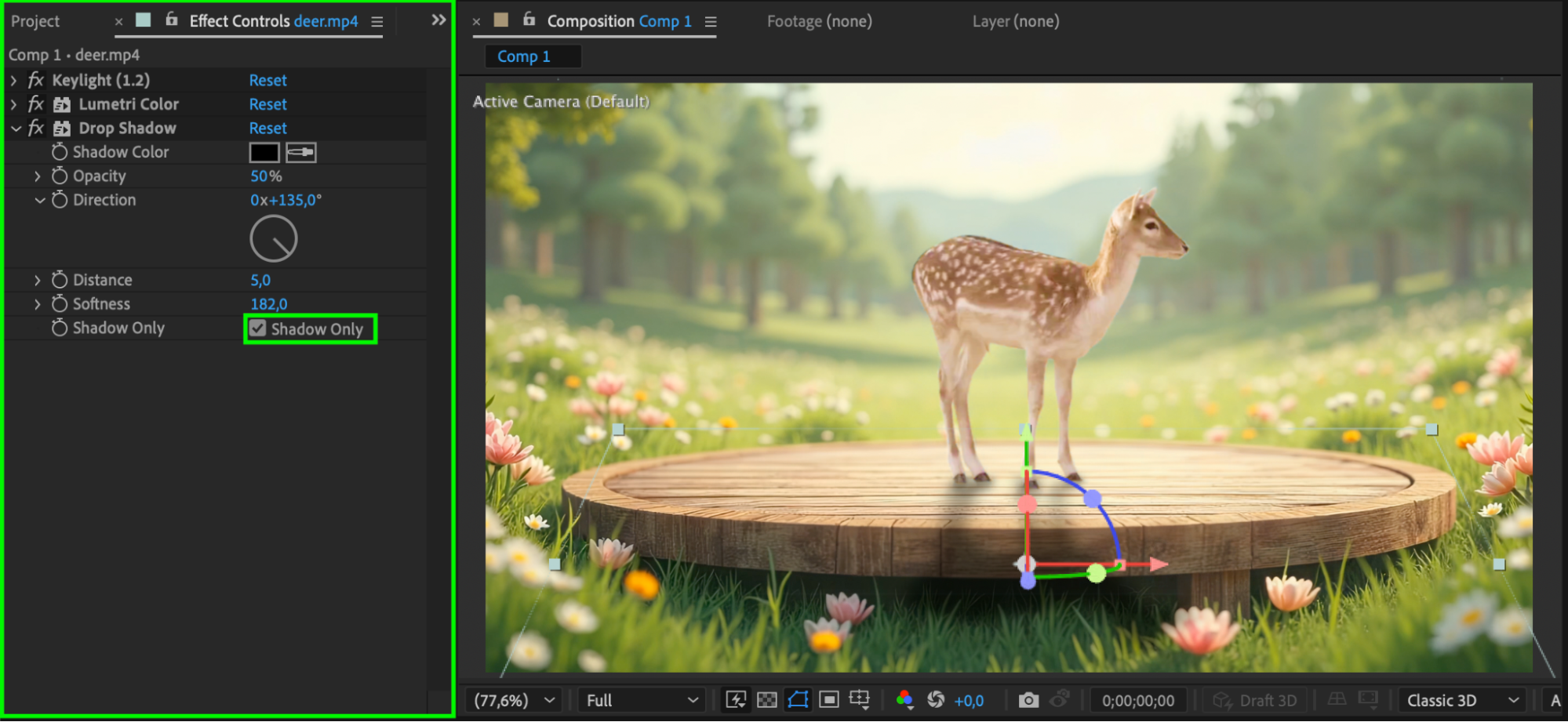 Duplicate the object layer and make the new one a 3D layer. Apply the Drop Shadow effect to this copy. In the Effect Controls, set Shadow Only to ON. Adjust the angle, distance, and softness to match your scene and add realism.