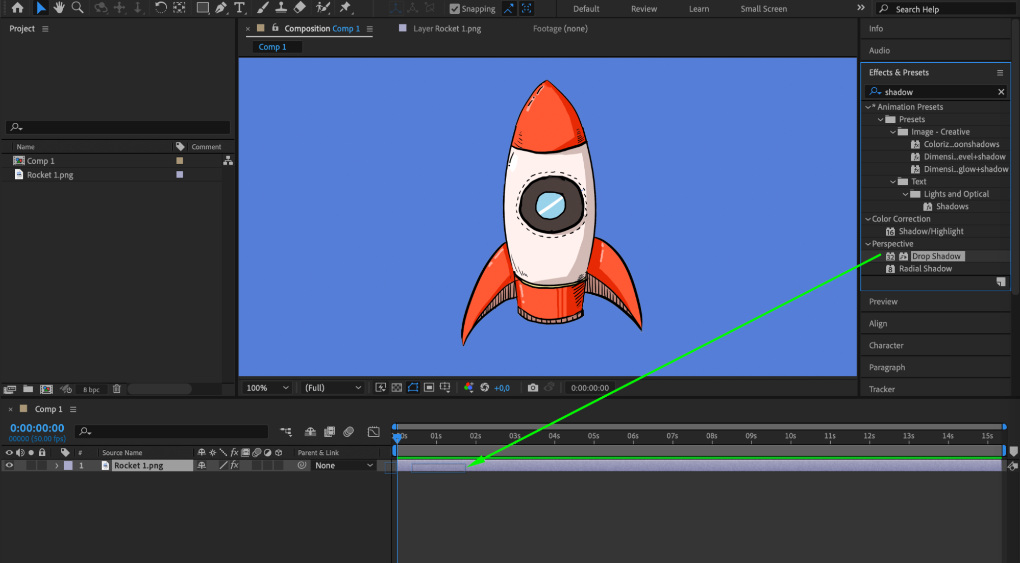 Select your object layer in the timeline panel and navigate to Effects & Presets. Search for “Drop Shadow,” apply the effect to your layer, and adjust parameters like opacity, direction, distance, softness, and color.
