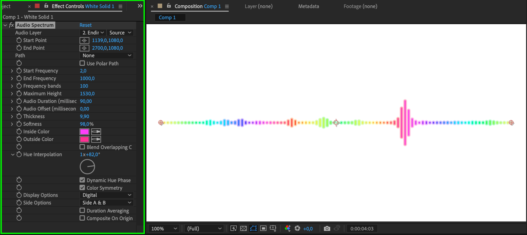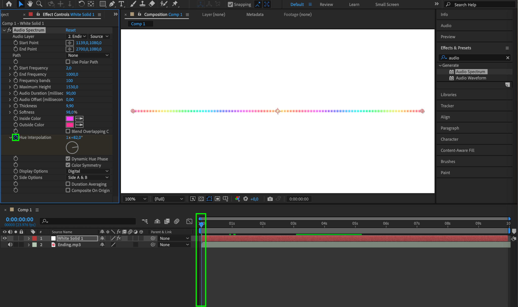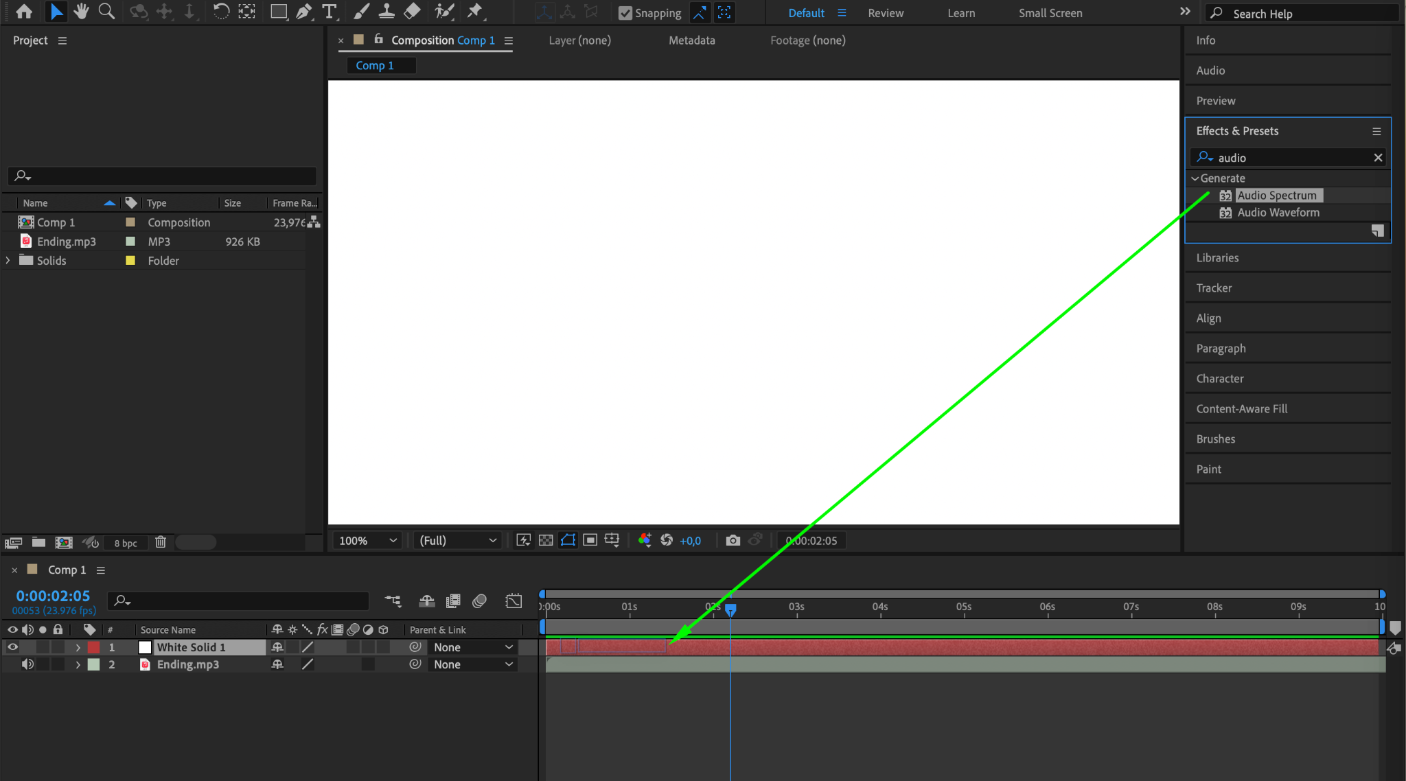 Now it’s time to add the audio spectrum effect. This effect will analyze the audio and create a visual representation of the sound waves. In the Effects & Presets panel, search for “audio spectrum” and drag the effect onto your solid layer.