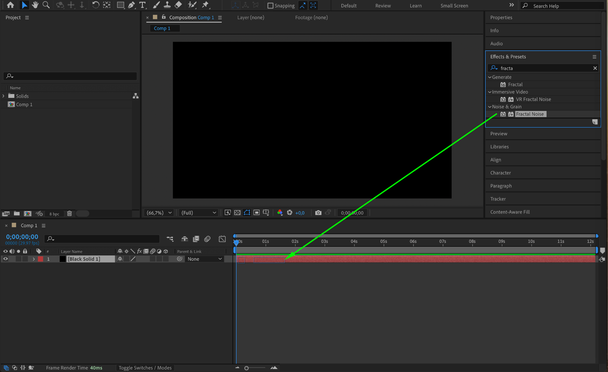 From the Effects & Presets panel, search for Fractal Noise and apply it to the solid layer. This effect will generate the foundational static texture for your TV effect.