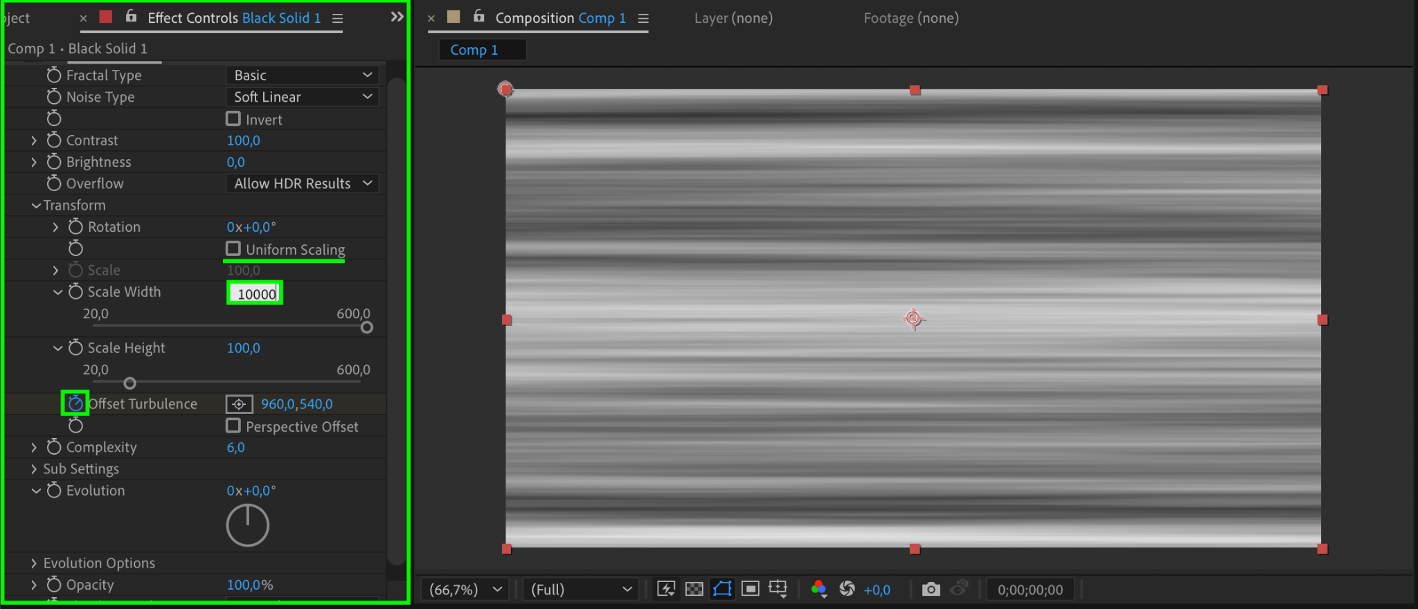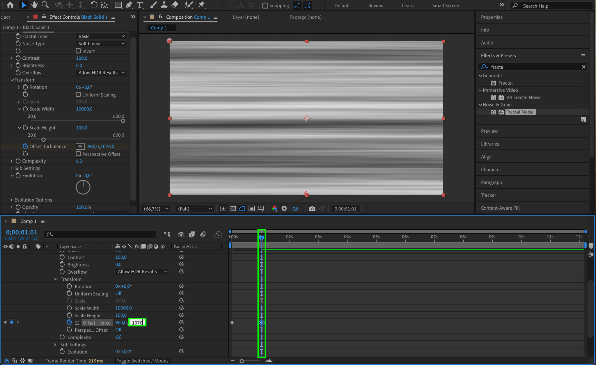 Change the Y value of Offset Turbulence to 1070. This creates movement in the static effect.