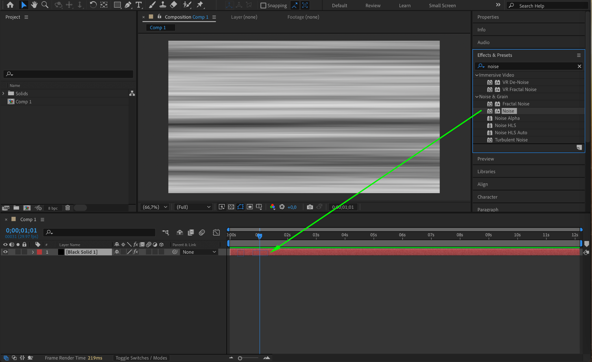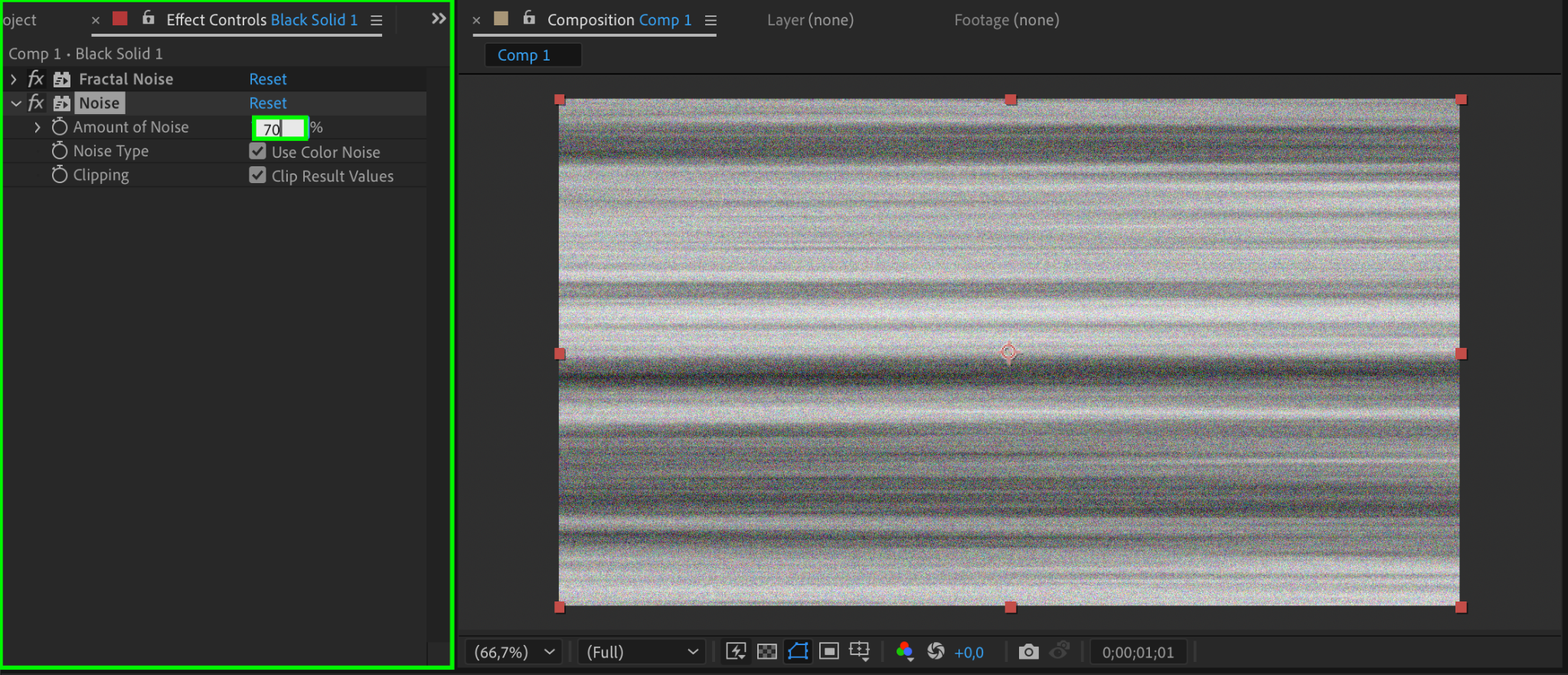Search for the Noise effect in the Effects & Presets panel and apply it to the layer. In the Effect Controls, set the Amount of Noise to 70. This adds a grainy texture, enhancing the realism of the static effect.