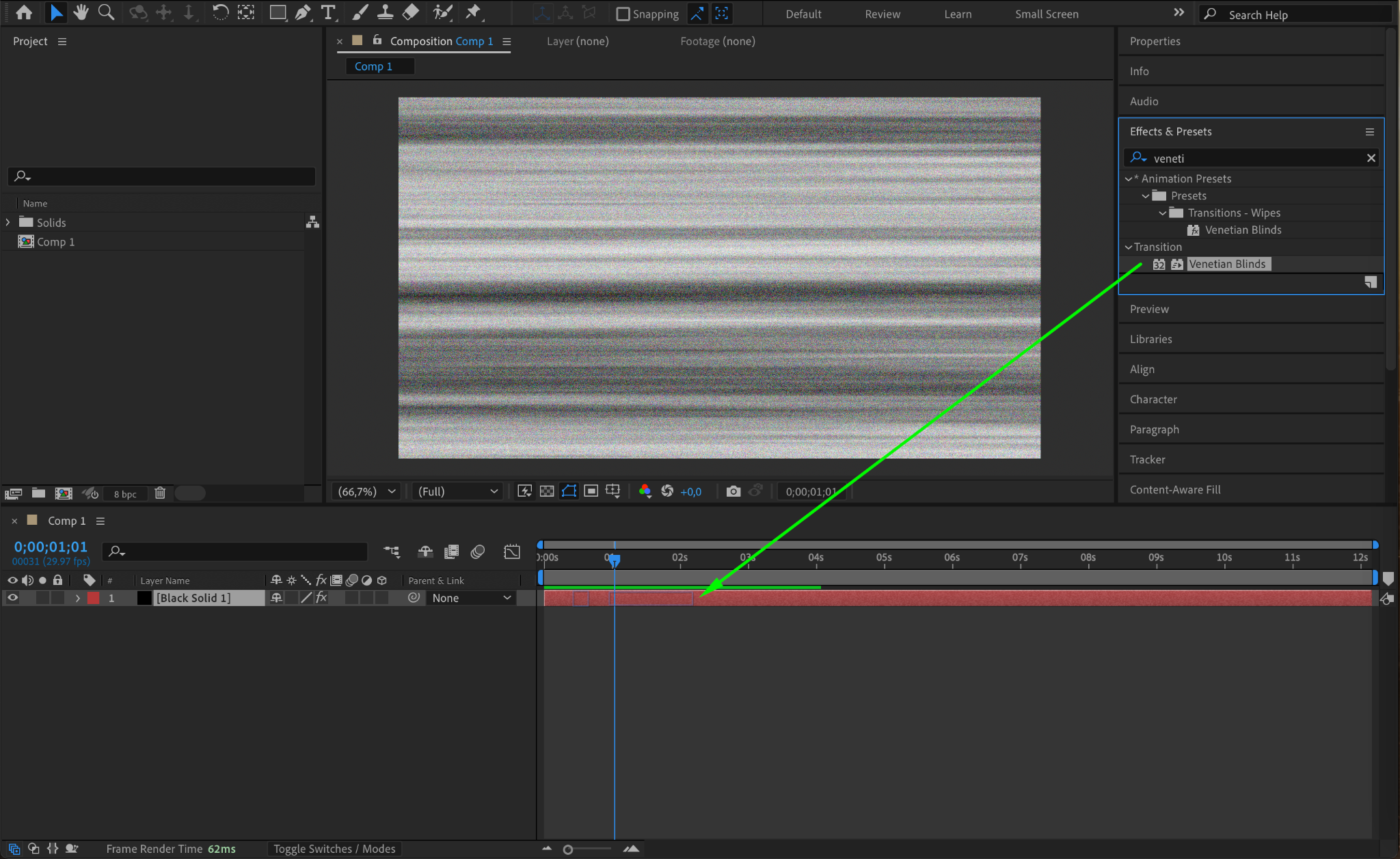 Go to Layer > New > Solid. Choose black as the color and ensure the solid fills the entire composition. This will serve as the base layer for your static effect.