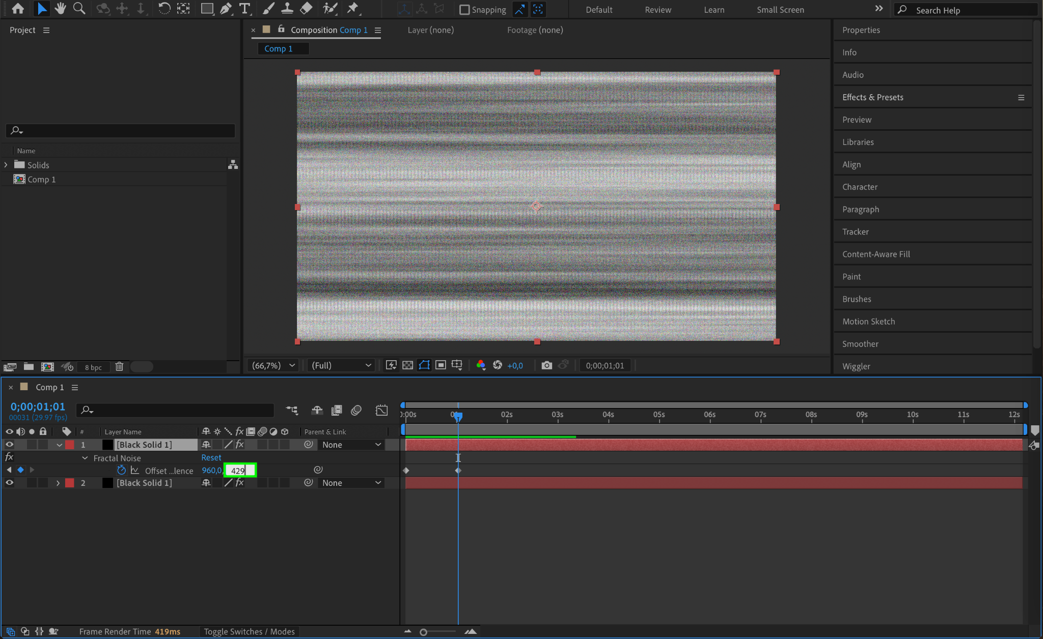 In the duplicate solid layer, change the Y value of the second Offset Turbulence keyframe to 429. This creates variation between the two layers, making the static more dynamic.