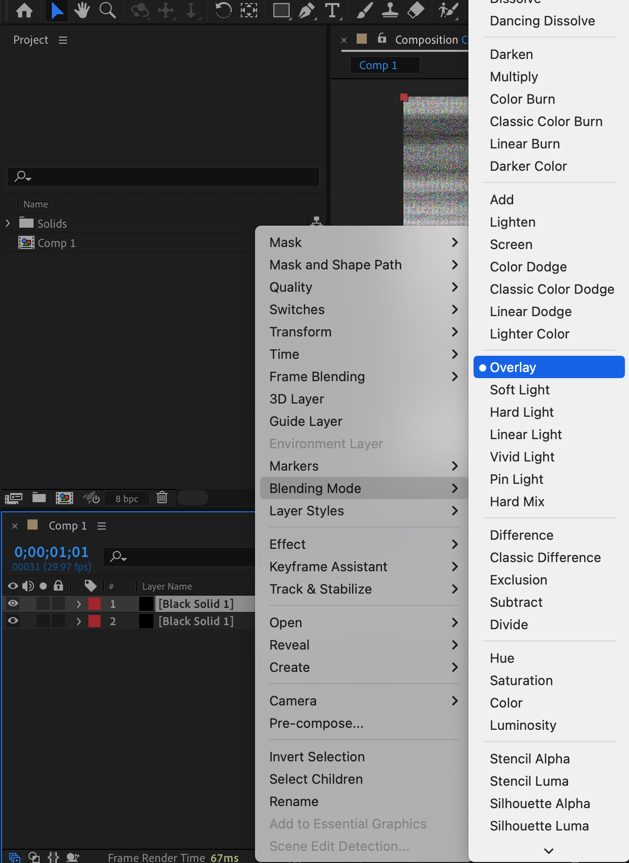 Set the blending mode of the duplicate solid layer to Overlay. This combines the two layers, creating a more complex and realistic static TV effect.