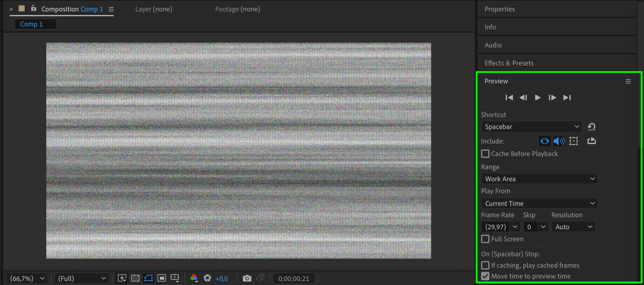 Use the Preview panel to play back your composition. Ensure the static movement and texture look realistic. Make adjustments to the keyframes or effects as needed.