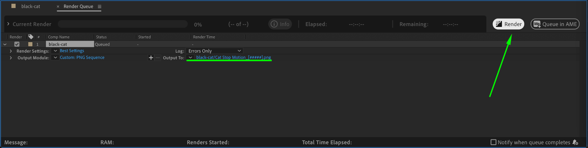 Go to Composition > Add to Render Queue. This step prepares your video for export as an image sequence, which will allow you to create the stop motion effect.