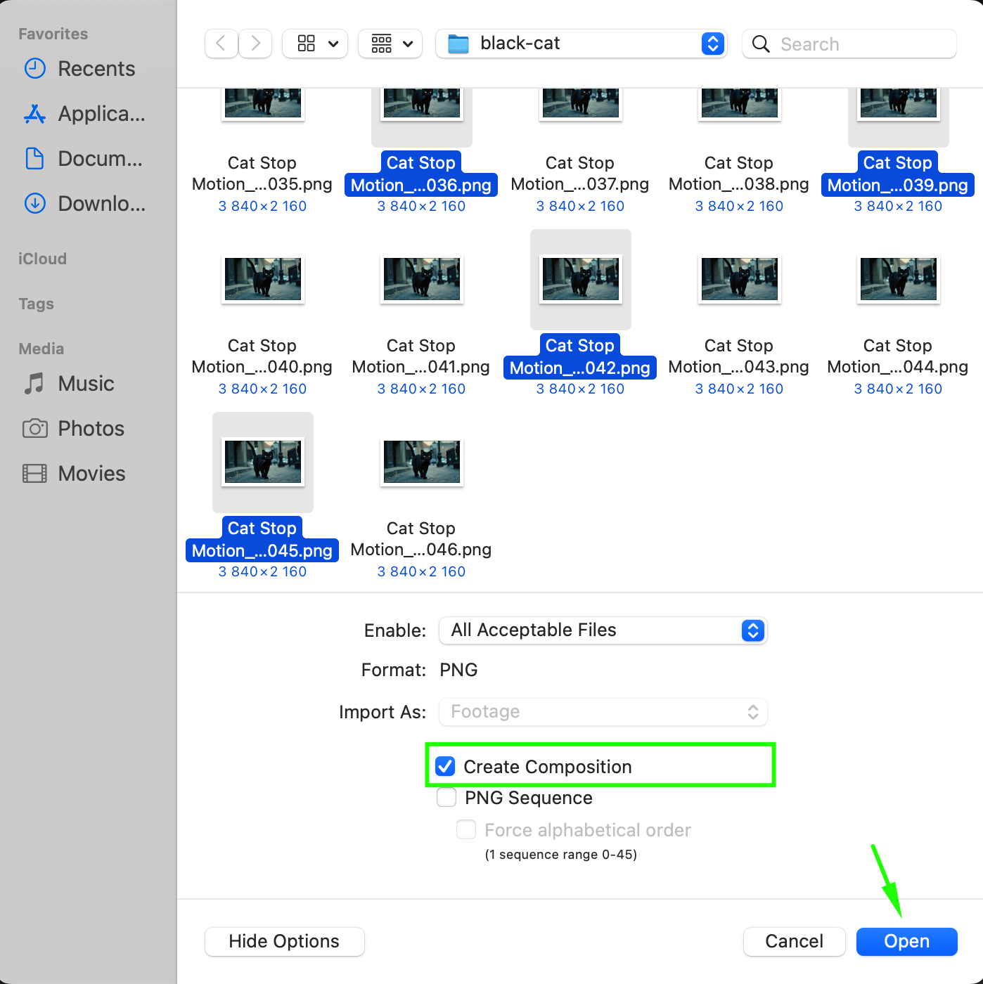Go to File > Import > File. Navigate to the folder containing your PNG sequence. Select the frames you want to use in your stop motion animation. For a true stop motion feel, consider skipping every 2-3 frames to reduce the frame rate. Ensure the checkbox for Create Composition is selected, then press Open.