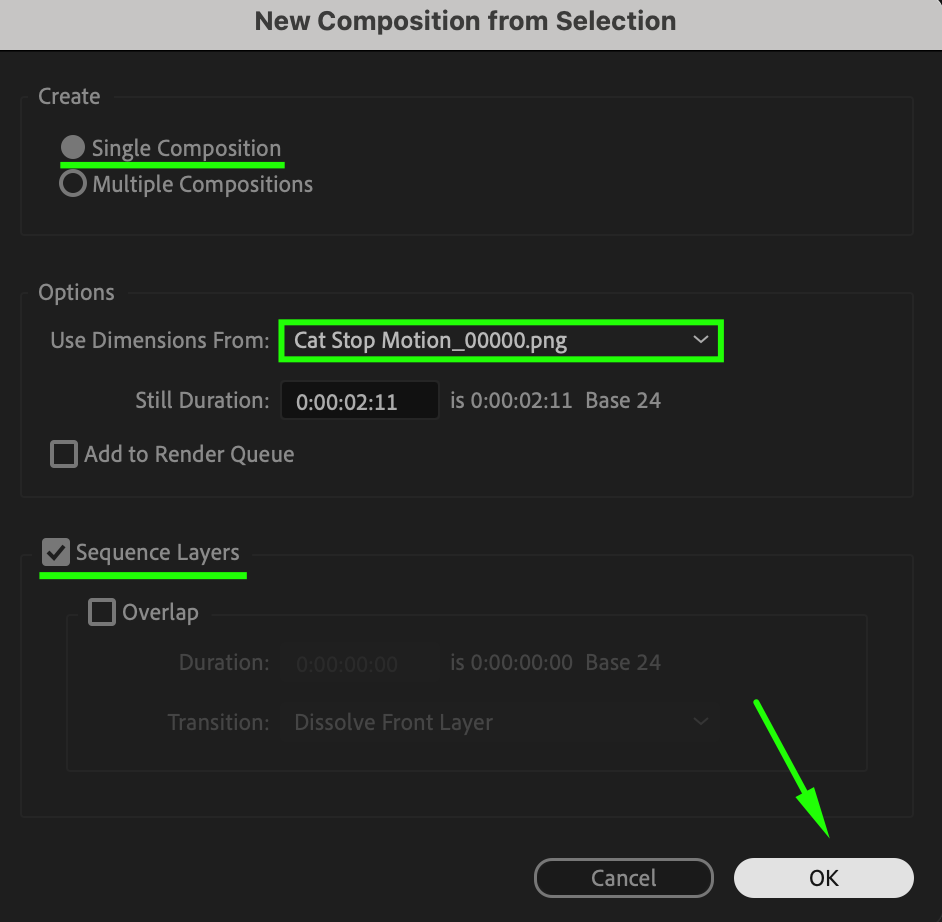 In the import settings window, choose Create as Single Composition and ensure the Sequence Layers checkbox is selected. Set the duration of each frame to match your desired stop motion speed (e.g., 1 frame per second for a choppy effect). Press OK to create the composition.