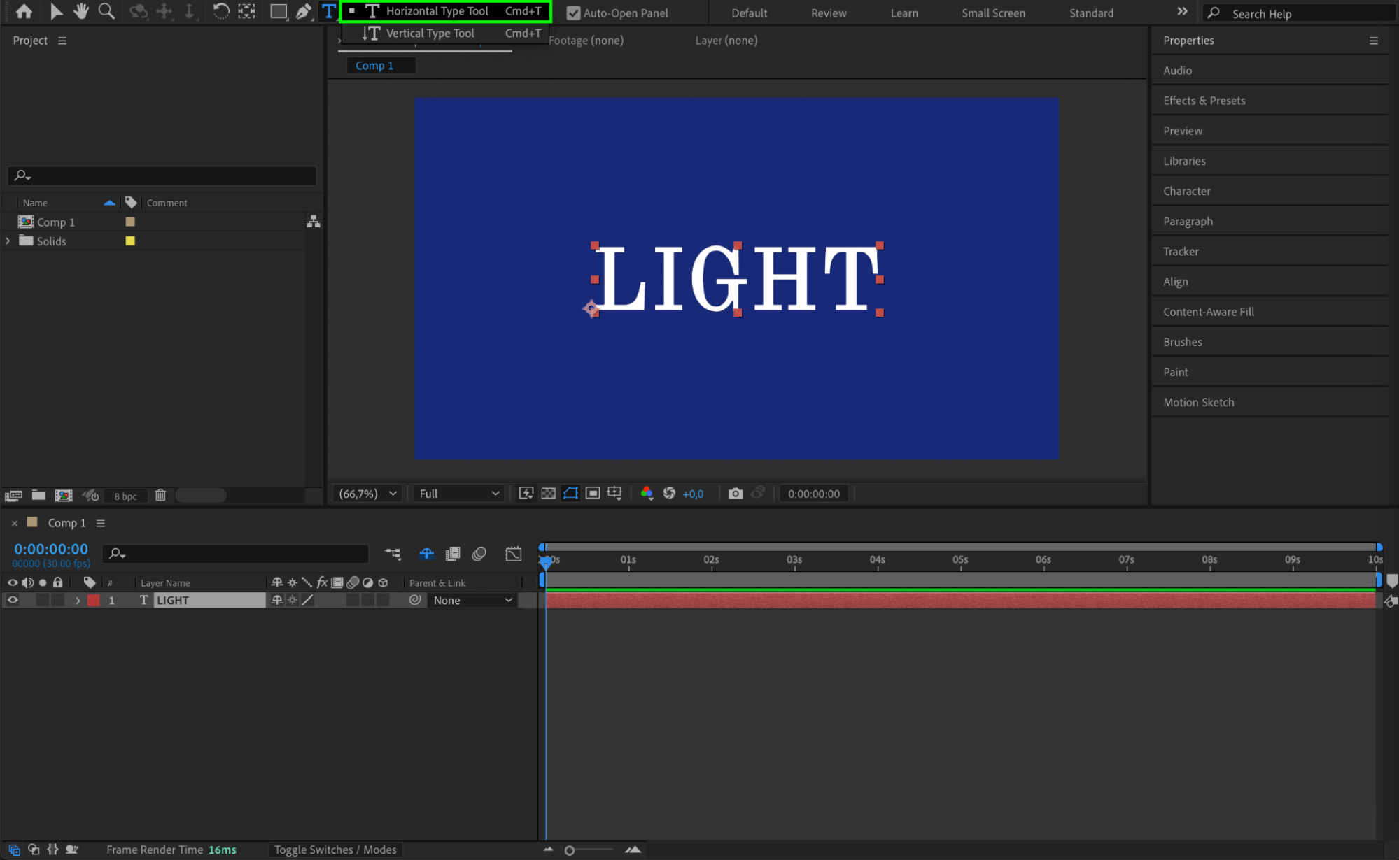 Select the Type Tool (Ctrl/Cmd + T) and click anywhere in the composition panel to type your text. Adjust the font size as needed by using the Character panel.