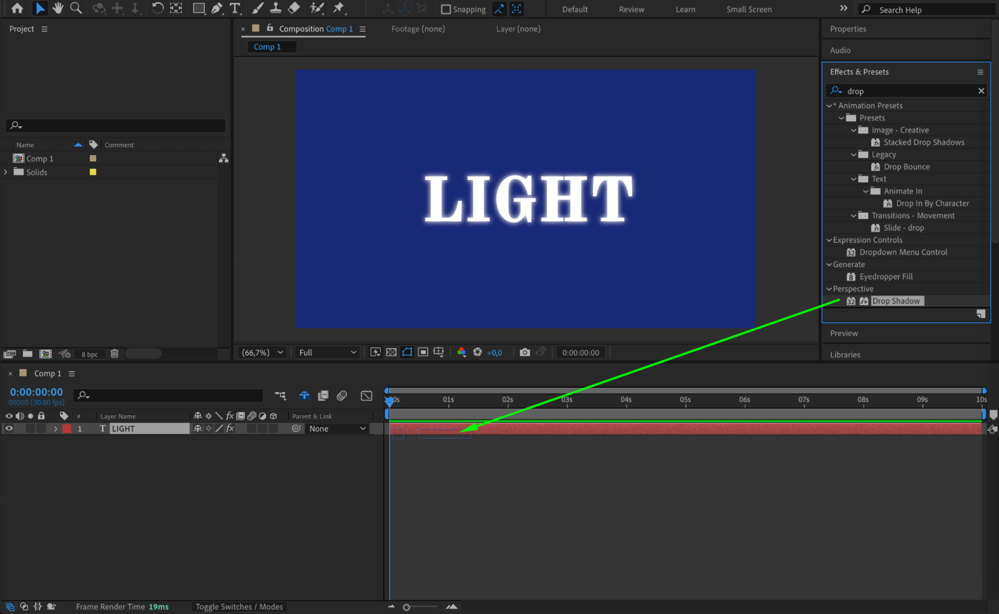 To give your text more depth, apply the Drop Shadow effect from the Effects & Presets panel. This creates a subtle shadow that makes the text stand out from the background. Adjust the Distance, Opacity, and Softness to your liking for a natural look.