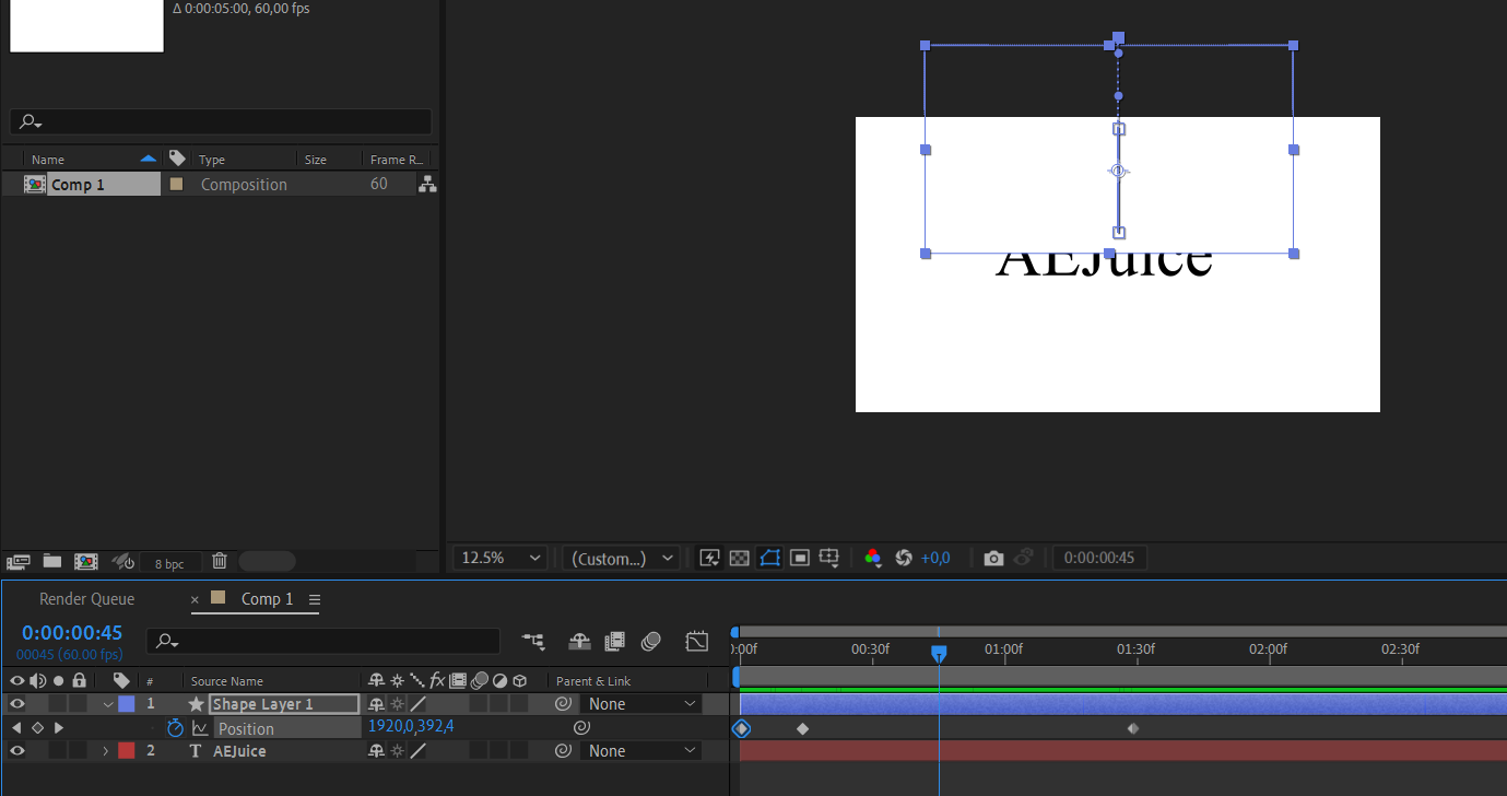 2. Position Keyframes: Create a new Shape Layer, for example, right-click in an empty area in the project, and choose “New > Shape Layer.” Press “P” to open the Position property. Set keyframes at the initial and final points on the timeline. Move to the final moment in time and change the Position value so that the text moves beyond the visible area.