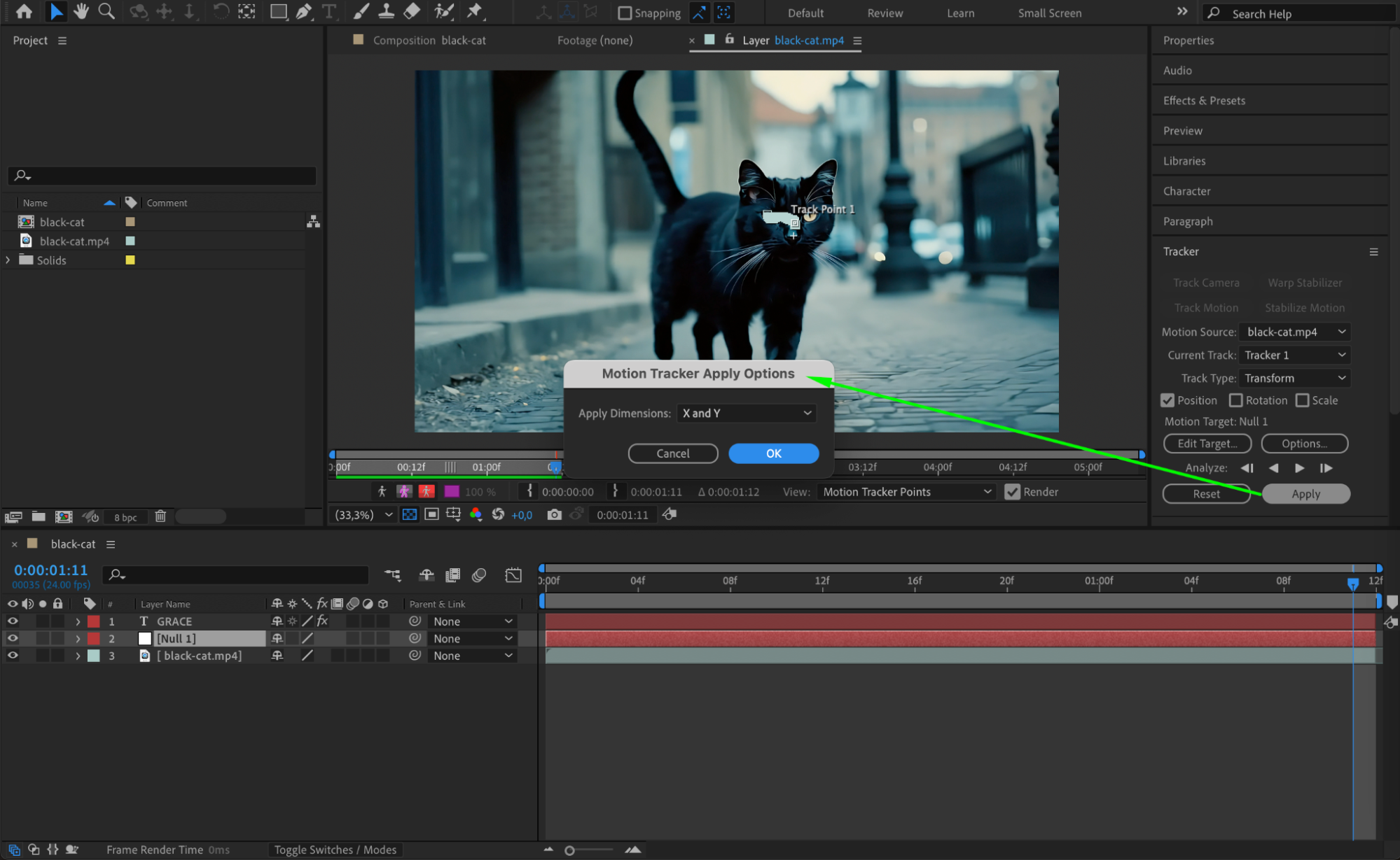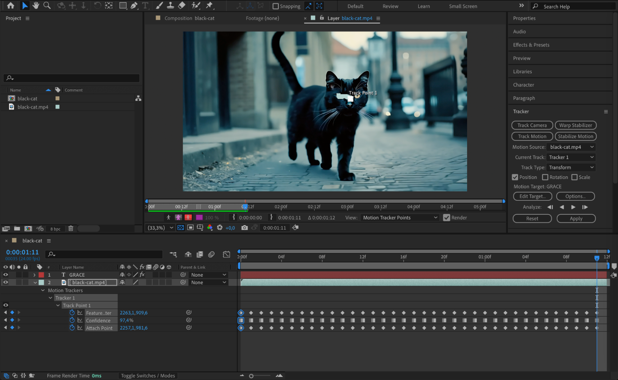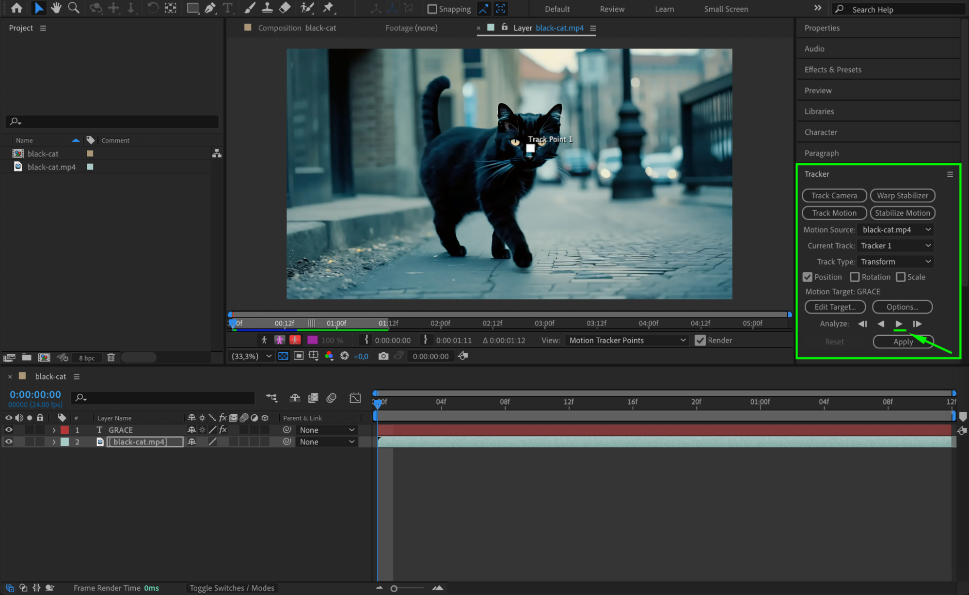 Press the Play (Analyze Forward) button in the tracker panel to let After Effects follow the object’s movement. Wait for the analysis to complete, making sure the track stays accurate.