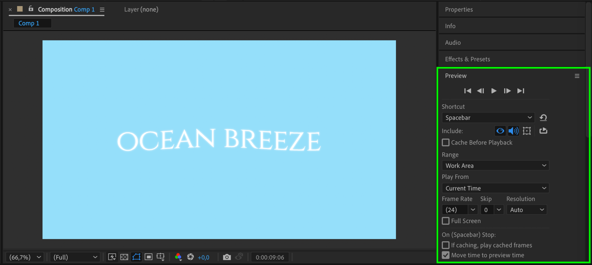 Press the Spacebar to preview your animation. Check how the wave effect interacts with your text and make adjustments to the Wave Width, Wave Height, or expression if necessary. This step ensures the effect looks polished and fits your design.