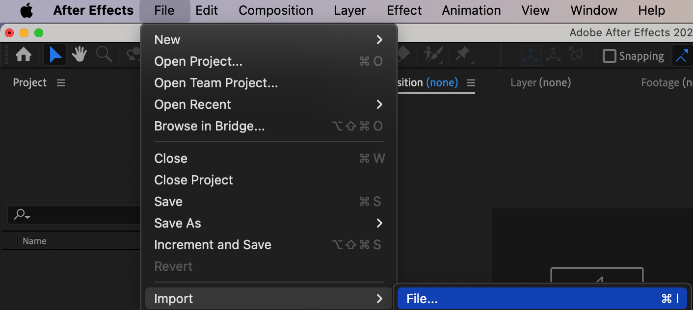 Open After Effects and import the video file you want to turn into a timelapse. Click on “File” -> “Import” -> “File”, choose your video file, and click “Import”.