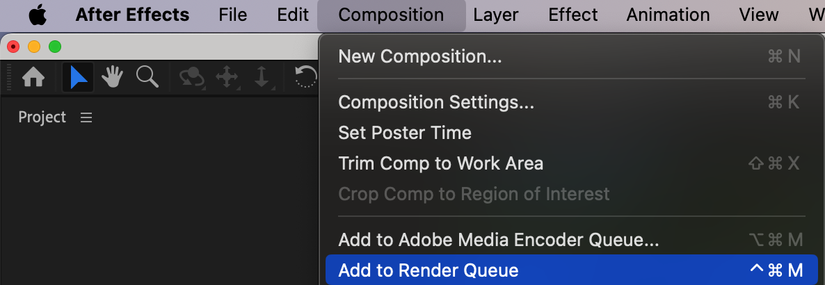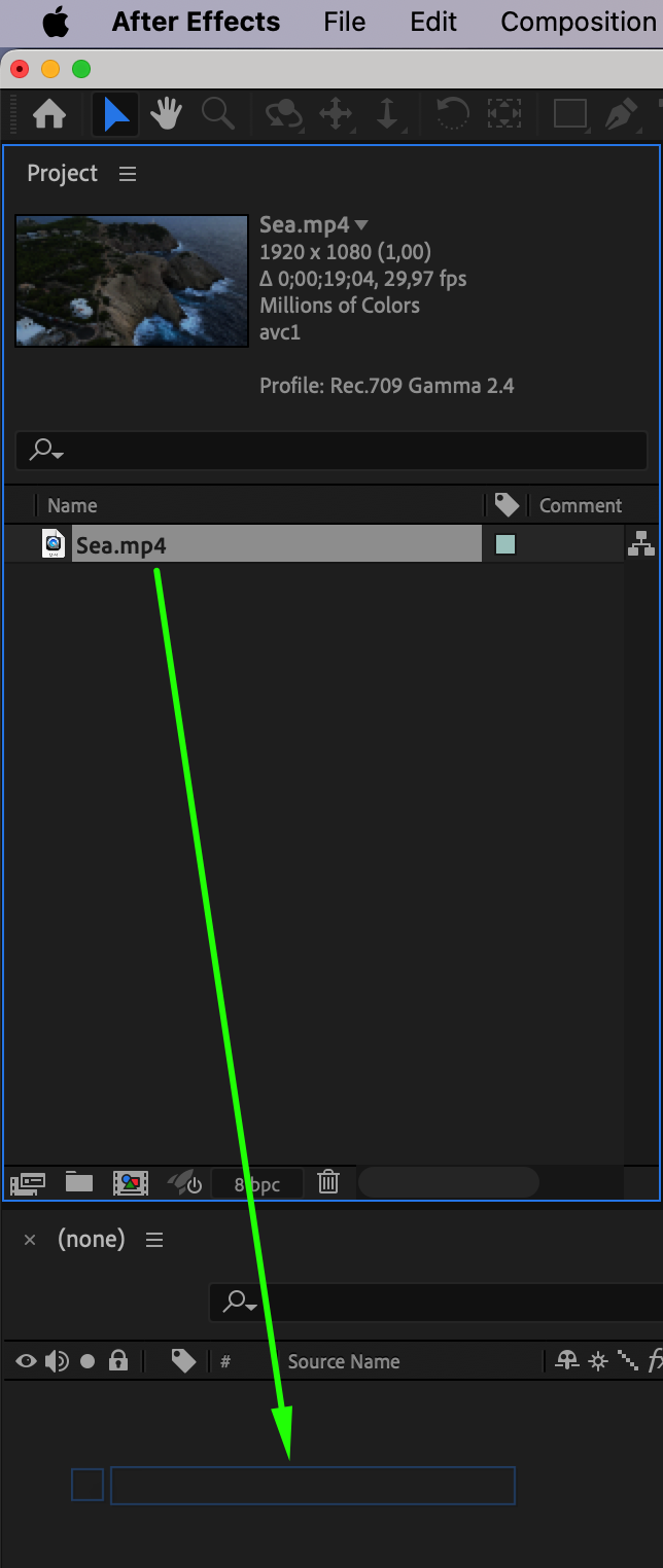 Drag your video file from the “Project” panel to the “Timeline” panel. This will create a new composition corresponding to your video.