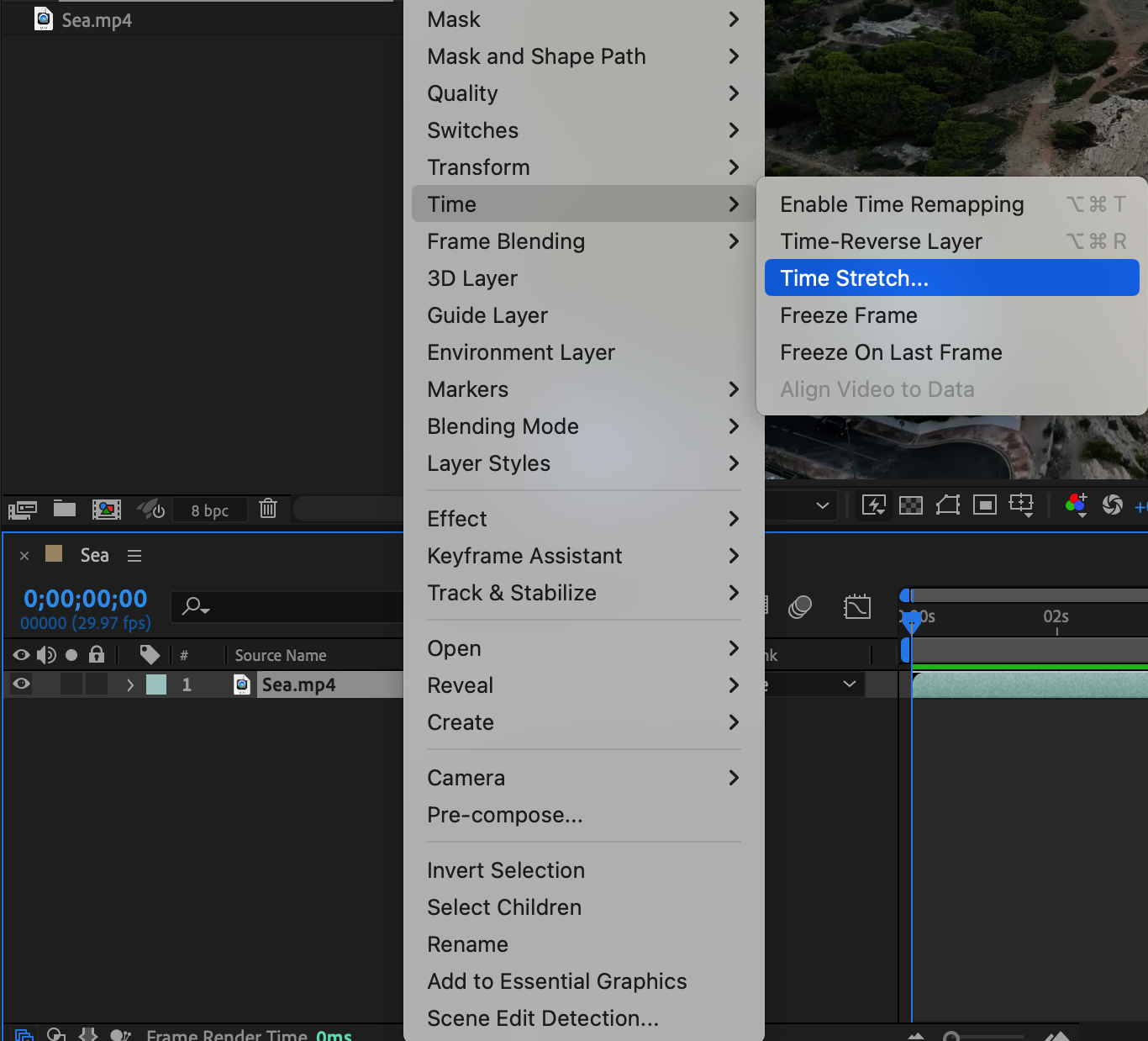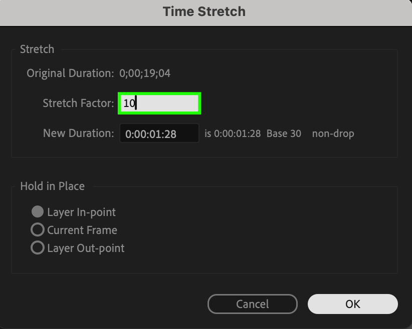 To create the timelapse effect, you need to speed up the playback of the video. Select your video file in the composition, then right-click and choose “Time” -> “Time Stretch”. Set the desired percentage of time acceleration. For example, to speed up by 10 times, set the value to “10%”.