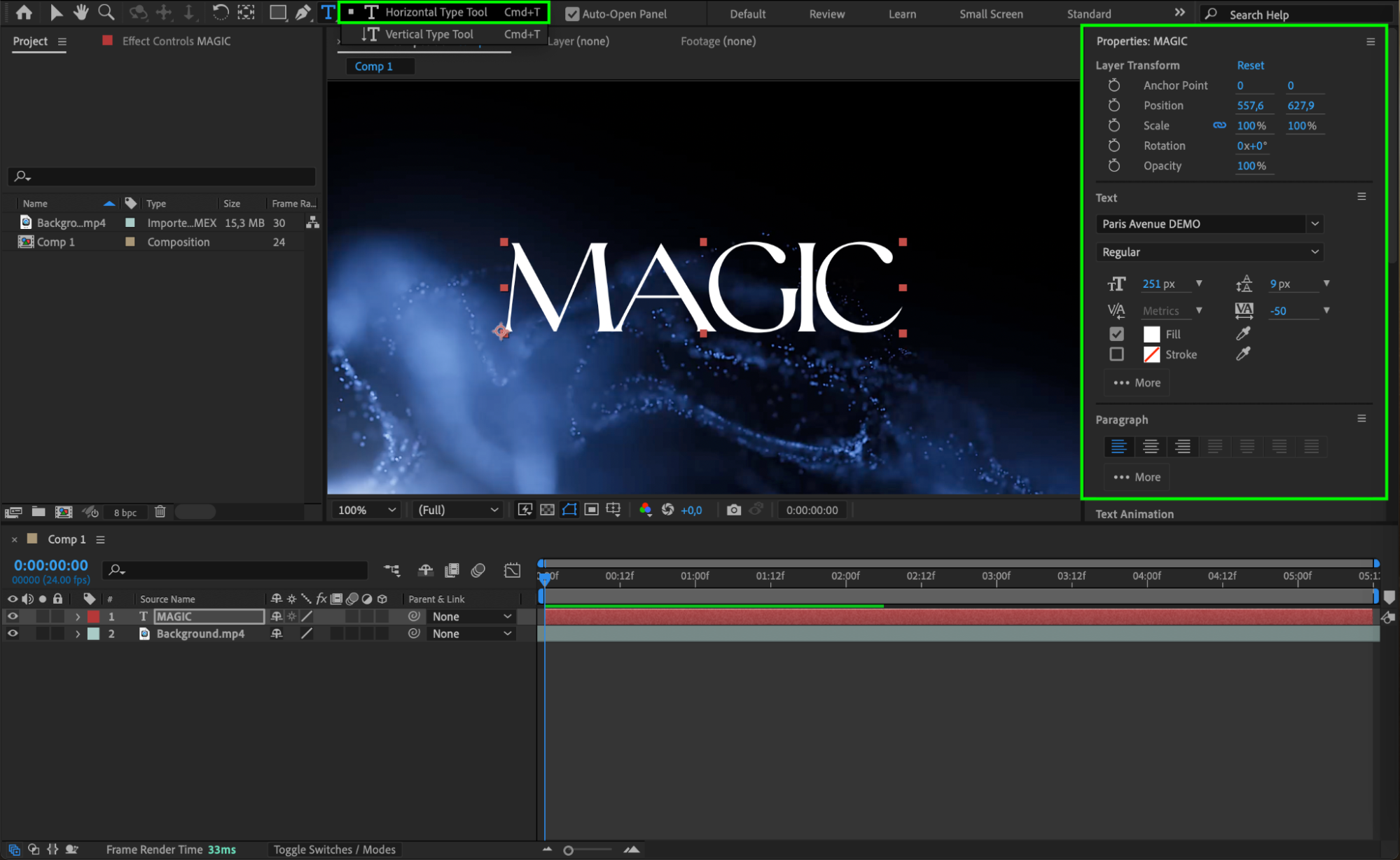 Now it’s time to add the text to your title card. Select the Type Tool (Ctrl/Cmd + T) and click anywhere in the composition to start typing. Choose the appropriate typography that matches the tone and style of your video. Experiment with different fonts, sizes, and colors until you find the perfect combination. Keep in mind that simplicity and readability are key, especially if your text needs to be easily understood at a glance.