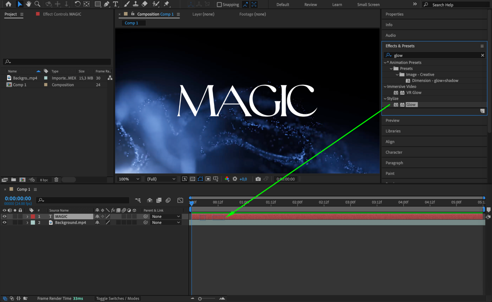 To further elevate your title card, you can add shapes, graphics, or visual effects. Use the Effects & Presets panel to explore options like shape layers, masks, gradients, and glow effects. These elements can add depth and visual interest to your title card.