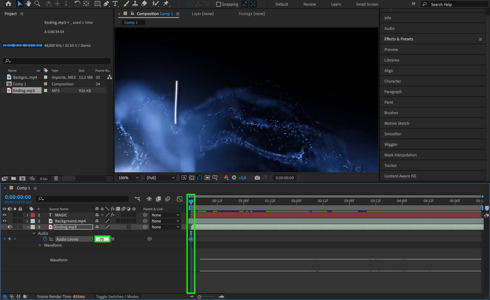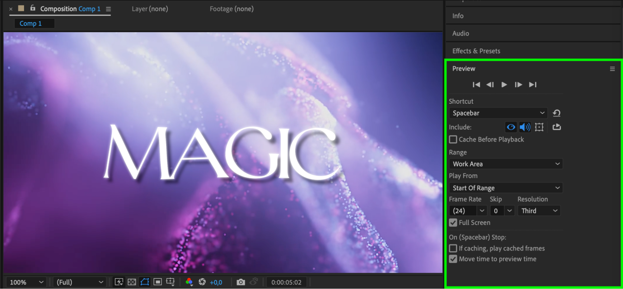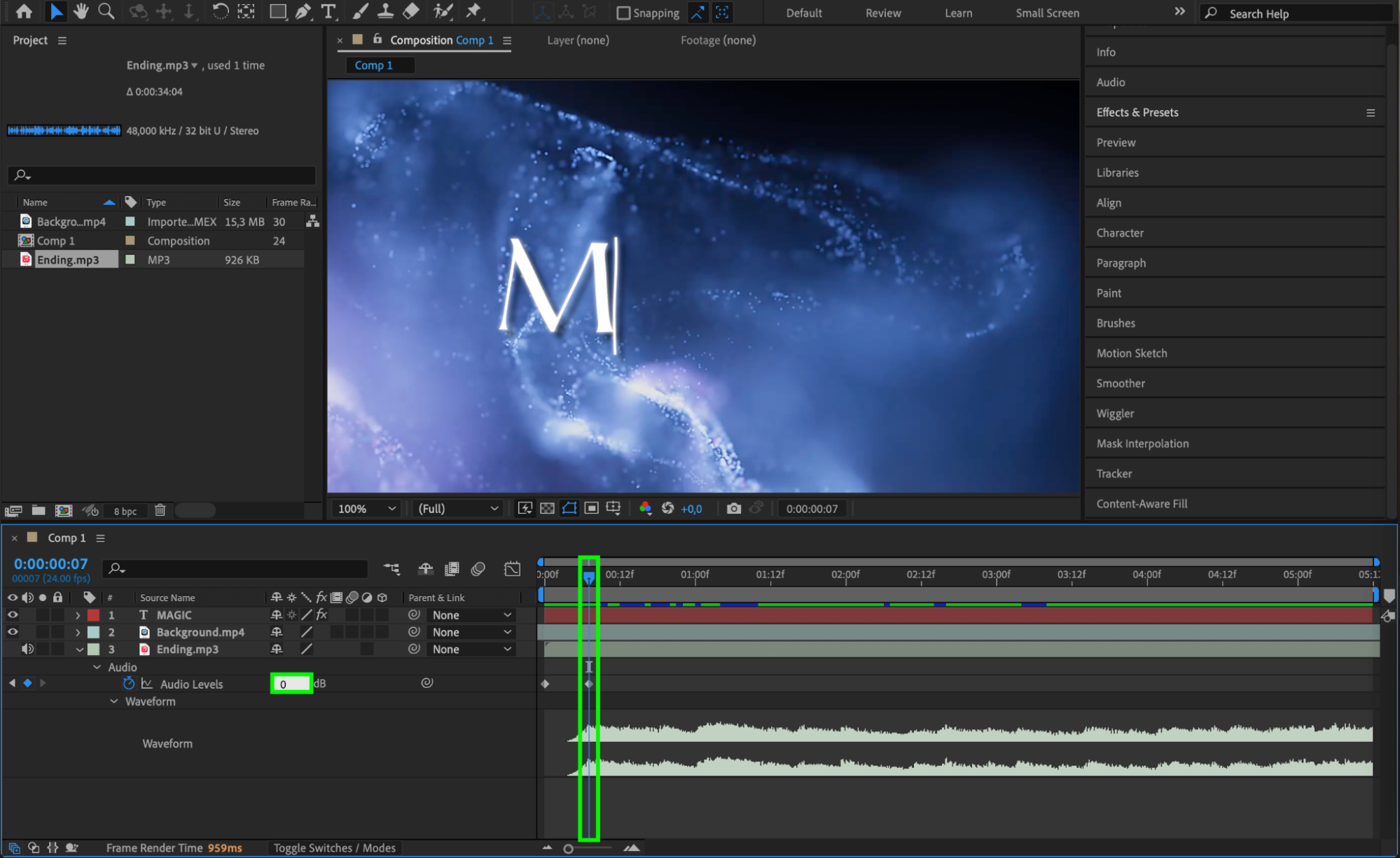a fade-in effect by adjusting the Audio Levels property with keyframes. Adding subtle sound effects that align with your text animation can make the title card more immersive and help convey the intended mood or message of your video.