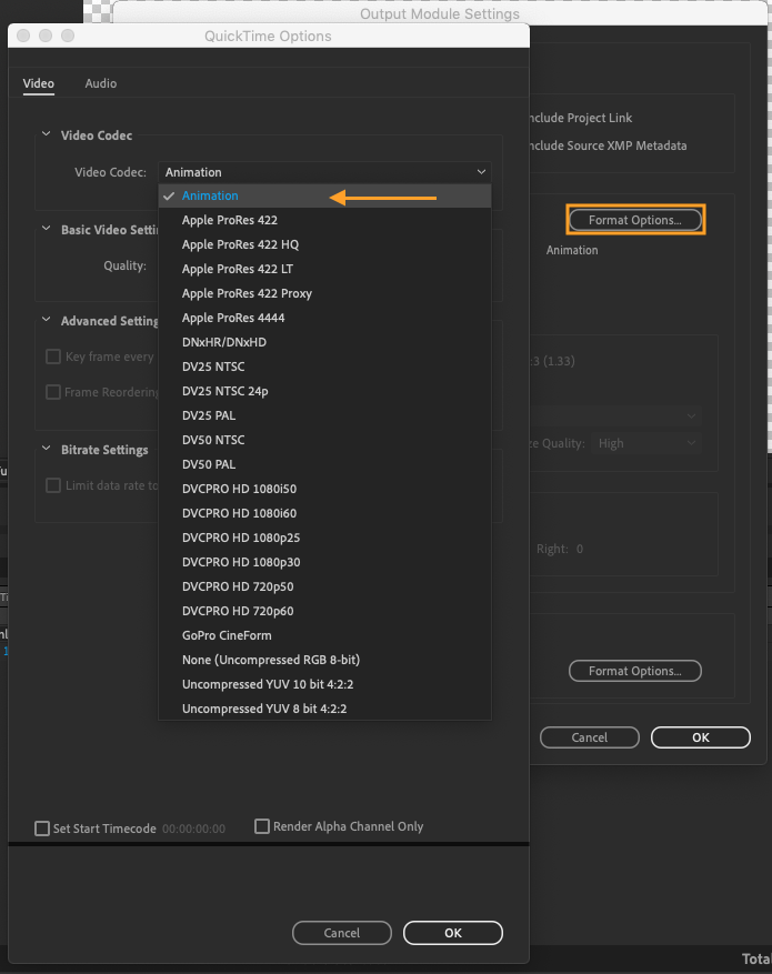7. In the Format Options, select Animation as the video codec and hit OK.