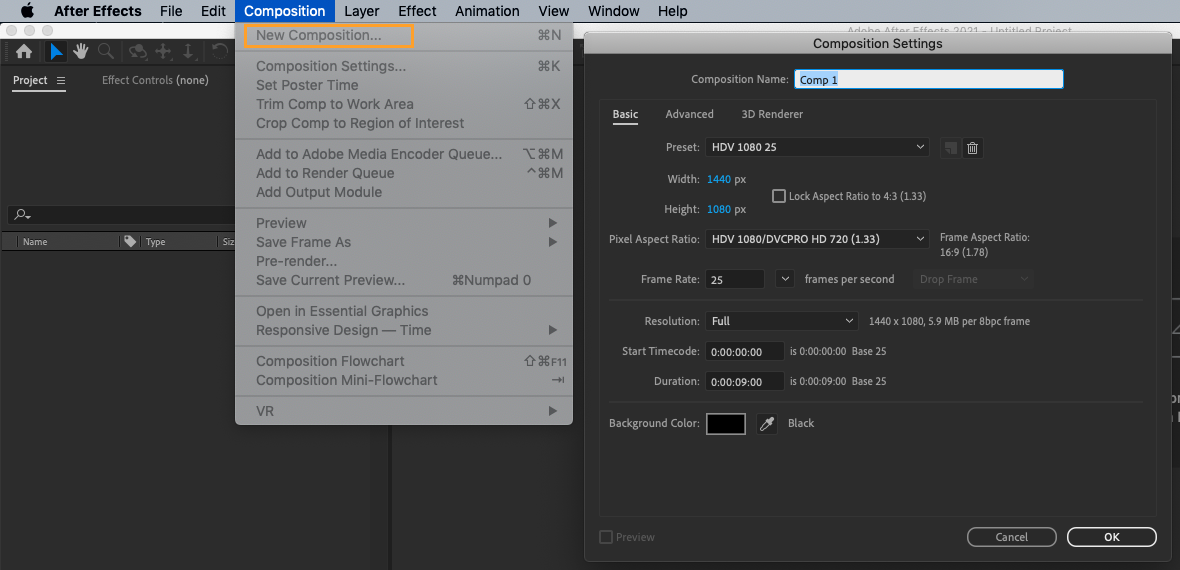 2. Go to the Composition menu and select New Composition. Set the desired width, height, duration, and frame rate for your project.