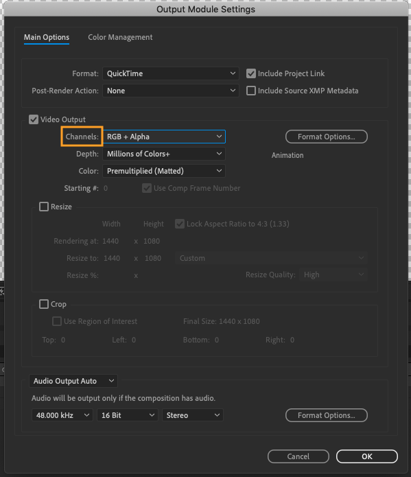 6. In the Render Queue tab, set the Output Module settings to Lossless and choose Quicktime as the format.